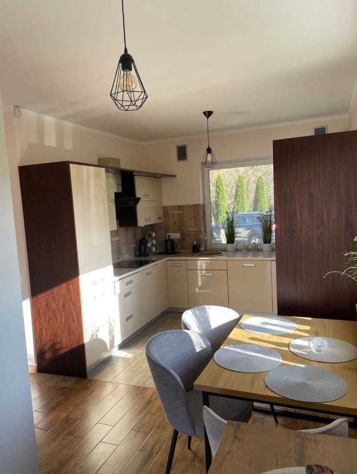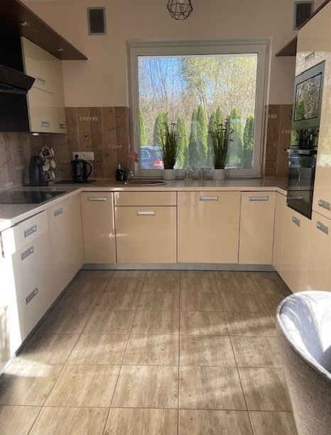 PODŁOGI: w salonie, kuchni, łazienkach, korytarzu i pomieszczeniu gospodarczym - płytki, w pokojach panele podłogowe. INSTALACJE: ogrzewanie podłogowe (maty grzewcze) na całej powierzchni parteru ( każde pomieszczenie ma osobny sterownik temperatury), kominek z funkcją pieca - ogrzewa salon oraz doprowadza ciepło do pozostałych pomieszczeń (system CEBUD z modułami akumulacyjnymi. Klimatyzacja z funkcją grzania w salonie. Własna studnia (32 m) ze stacją uzdatniania wody, szambo ekologiczne, instalacja alarmowa w całym domu i garażu.