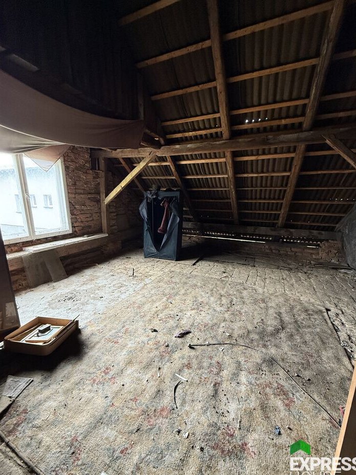 Na poddasze dostaniemy się drewnianymi schodami, które są w dodatkowej drewnianej części domu. Istnieje możliwość rozbudowy domu o tą część Na poddaszu można urządzić oddzielne mieszkanie lub dwa przestronne pokoje. Możliwości jest naprawdę dużo w zależności od wizji kupującego.