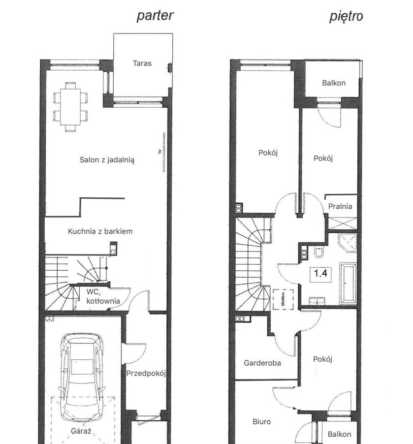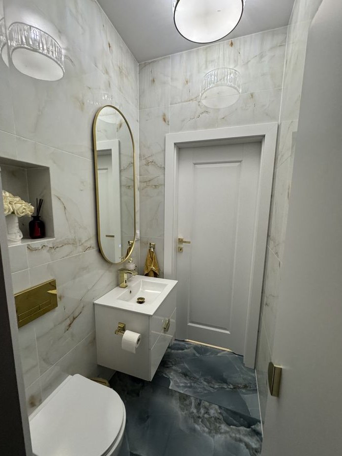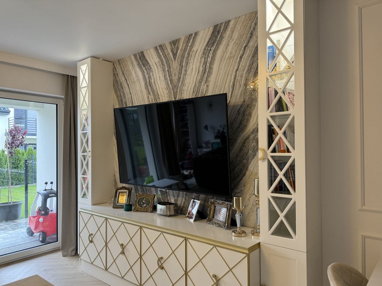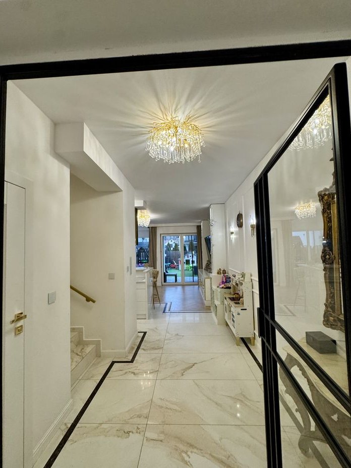 Parter: Powita Państwa elegancki przedsionek z pojemnymi szafami w zabudowie oraz lustrem. Znajduje się tu również toaleta, z dostępem do kotłowni i możliwością podłączenia pralki oraz suszarki. Nowoczesny aneks kuchenny, w pełni wyposażony w wysokiej klasy sprzęt AGD, charakteryzuje się licznymi szafkami sięgającymi sufitu. Przestronny salon zachwyca klasycznym parkietem w jodełkę, telewizorem 75 cali oraz unikatowymi, kamiennymi płytami sprowadzanymi na zamówienie, które nadają wnętrzu wyjątkowego charakteru.