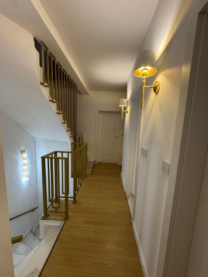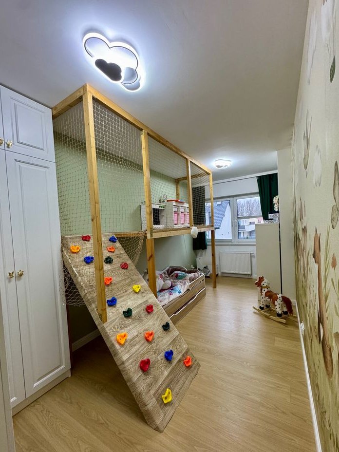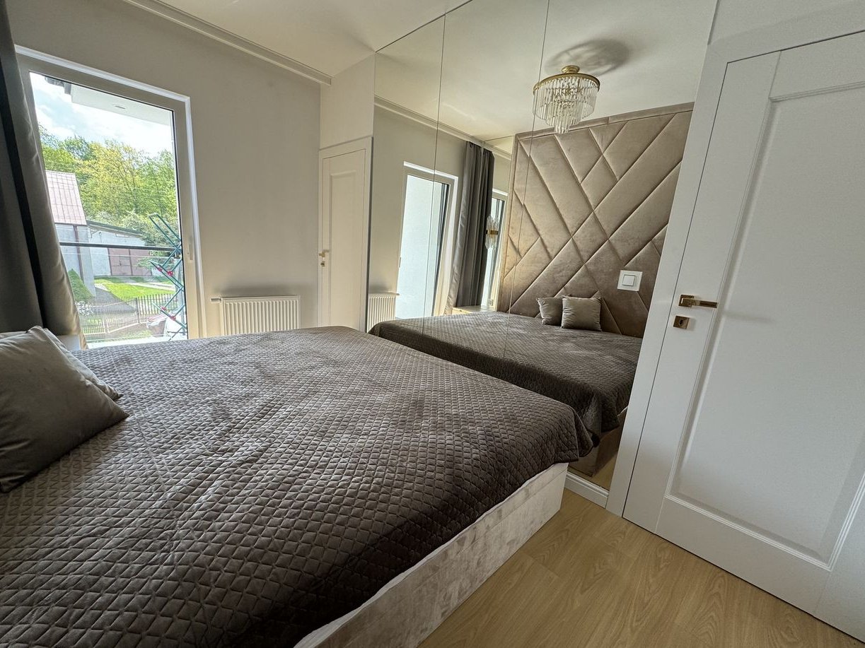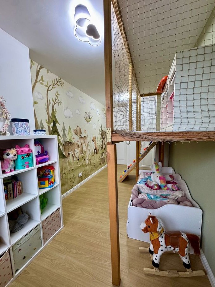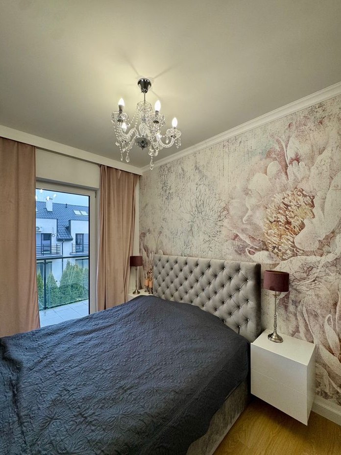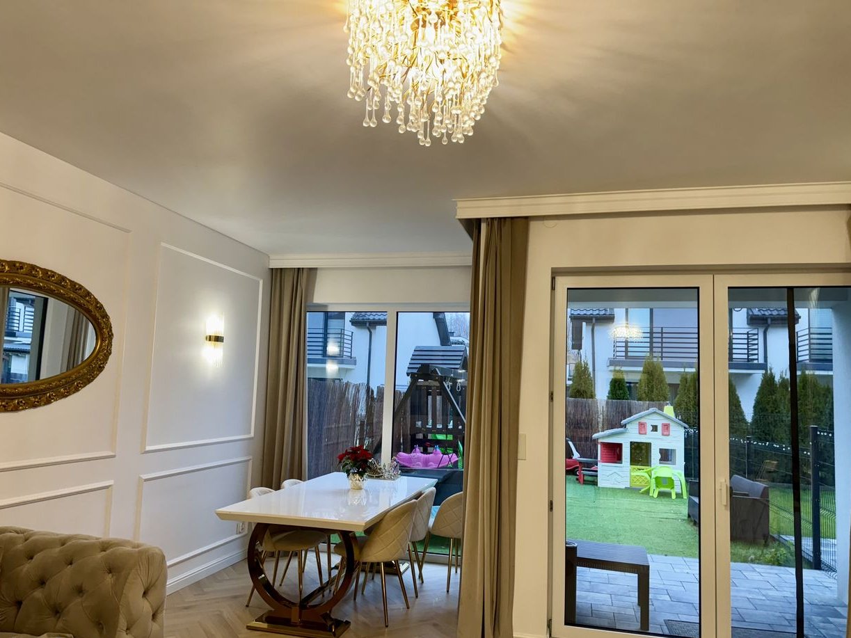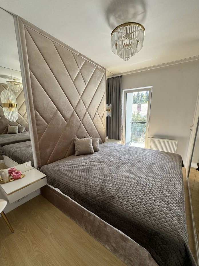 Piętro: To strefa prywatna, składająca się z luksusowej sypialni głównej z obszernym łożem małżeńskim (220 cm szer.) i zagłówkiem sięgającym sufitu, eleganckimi szafkami nocnymi oraz lustrem ściennym na całej ścianie. Z sypialni przejście do kameralnego, doświetlonego gabinetu – idealnego miejsca do pracy zdalnej, wyciszenia lub adaptacji na pokój dziecięcy. Dopełnieniem komfortu jest przestronna garderoba, w całości umeblowana meblami wykonanymi na wymiar. Duża łazienka oferuje wannę narożną, szeroki prysznic oraz podwójną umywalkę, przystosowaną do jednoczesnego użytkowania przez dwie osoby. Pokój dziecięcy z kreatywną mini ścianką wspinaczkową i uroczą tapetą z motywem leśnym. Druga sypialnia, obecnie pełniąca funkcję pokoju gościnnego, wyposażona jest w pikowane łóżko w stylu glamour i szafki nocne, a jej ścianę zdobi malownicza tapeta. Do sypialni przylega praktyczna garderoba, aktualnie zaadaptowana na pralnię.