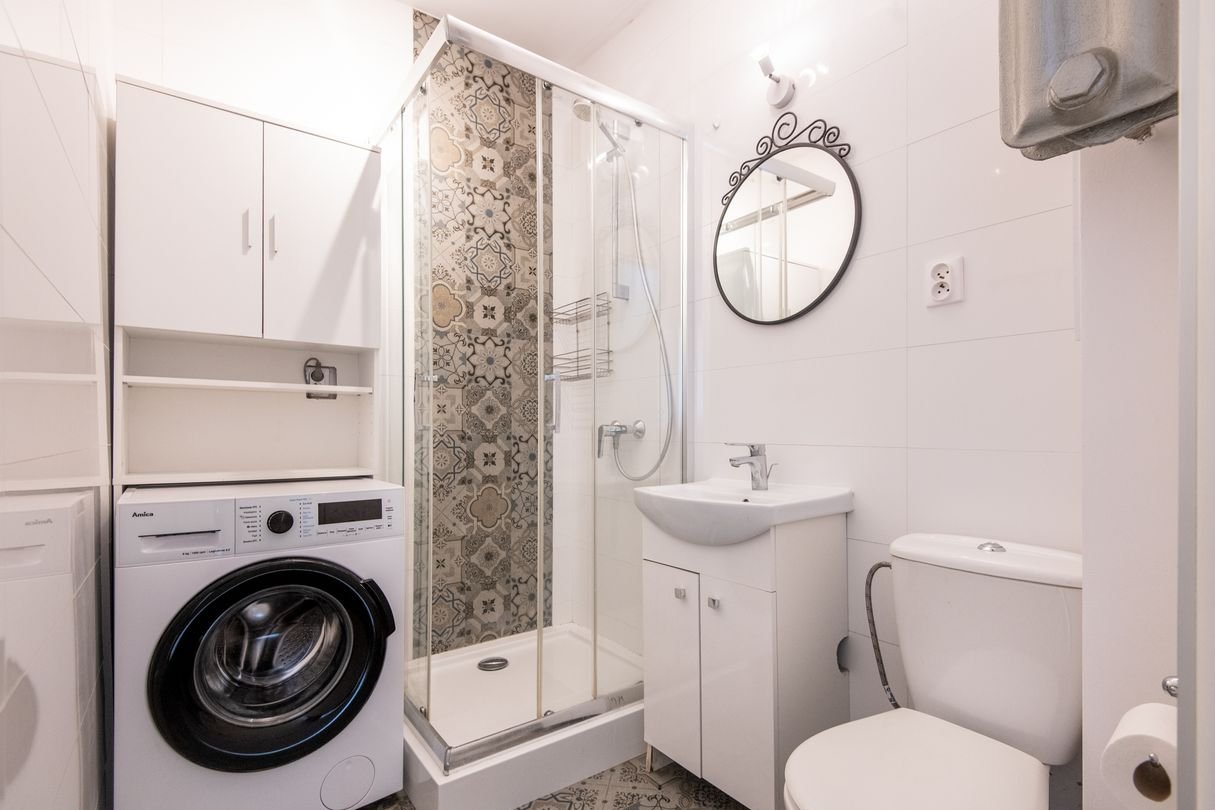 Łazienka: kabina prysznicowa, pralka.