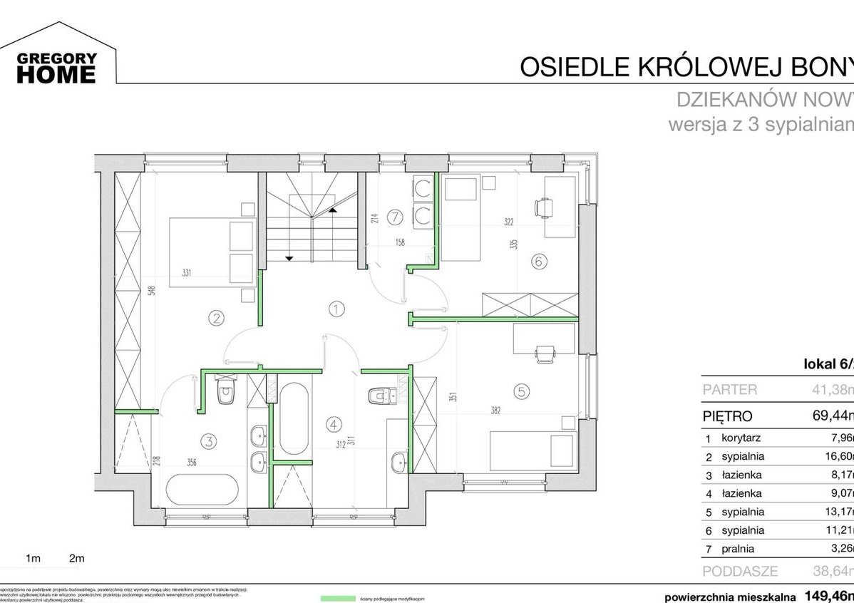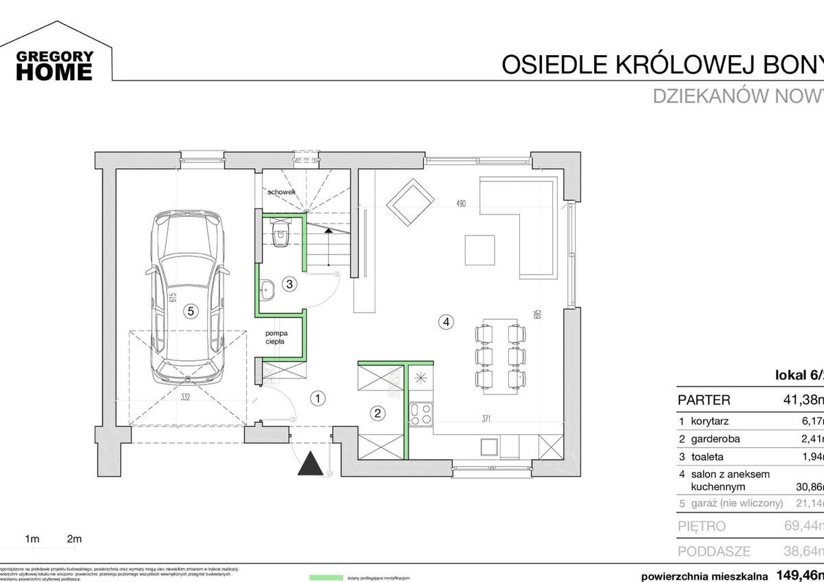 Domy zostały zaprojektowane o powierzchni użytkowej z garażami w przedziale od około 140 do około 172 metra kwadratowego. Każdy z lokali na parterze będzie posiadał salon z aneksem kuchennym, łazienkę z prysznicem, garderobę, korytarz i garaż. Na piętrze znajdziemy w każdym z lokali trzy lub cztery sypialnie, jedną lub dwie łazienki, oddzielne pomieszczenie techniczne z przeznaczeniem dla pompy ciepła, pralki i suszarki. Na poddaszu zaprojektowano duży pokój i co ważne z oknami w ścianach szczytowych i frontowych, aby nie było konieczności montażu okien połaciowych które mogłyby ograniczać montaż paneli fotowoltaicznych na dachu.