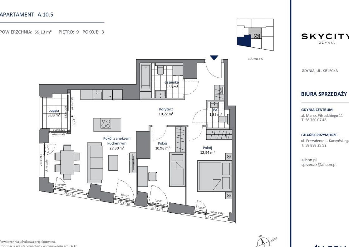 Apartament znajduję się na dziewiątym piętrze i składa się z :