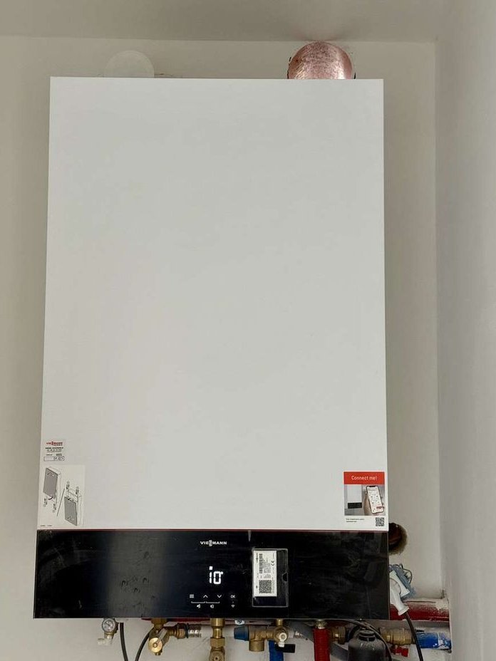 Piec gazowy Viessmann Vitodens 111-W z warstwowo ładowanym zasobnikiem wody, sterowany zdalnie przez aplikację WF;
