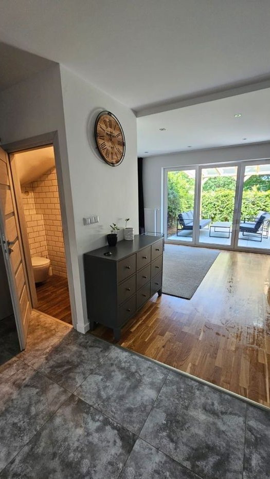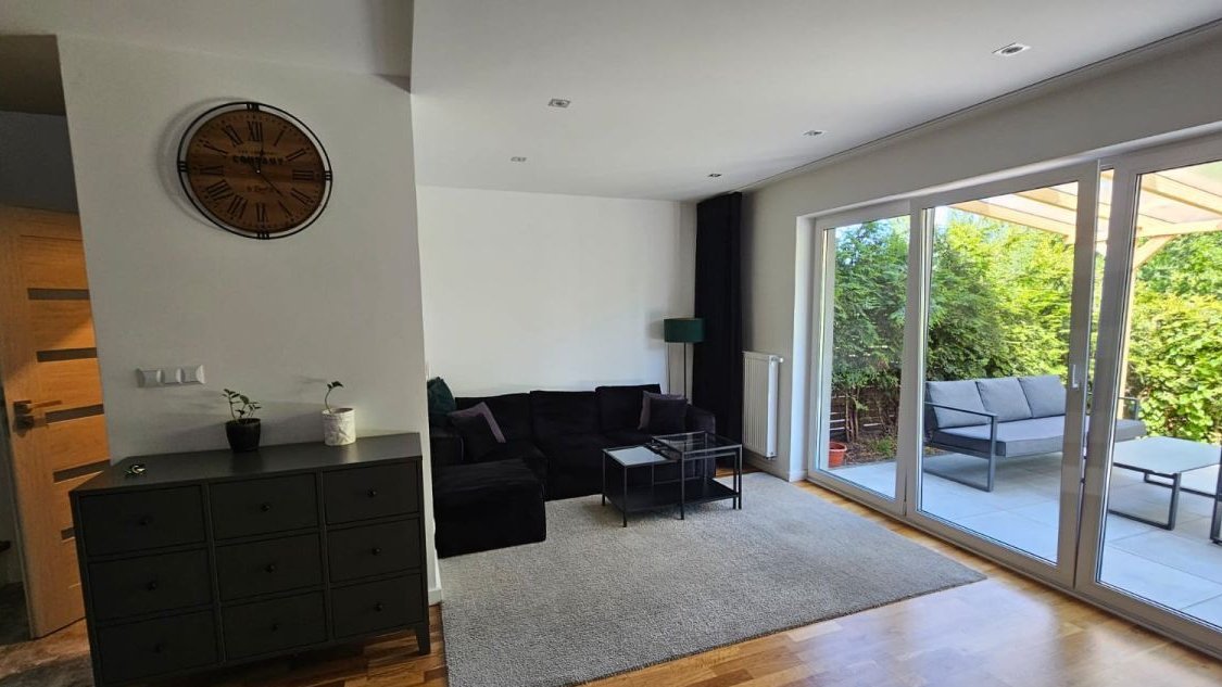 -przestronny salon z jadalnią i wyjściem na duży taras oraz ogród,