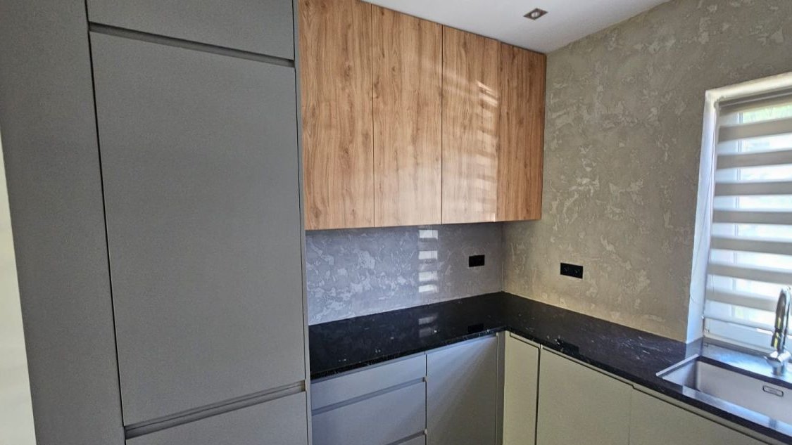 Na podłodze deska barlinecka, wysokiej jakości zabudowa kuchni wraz ze sprzętem AGD.