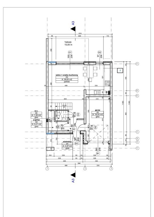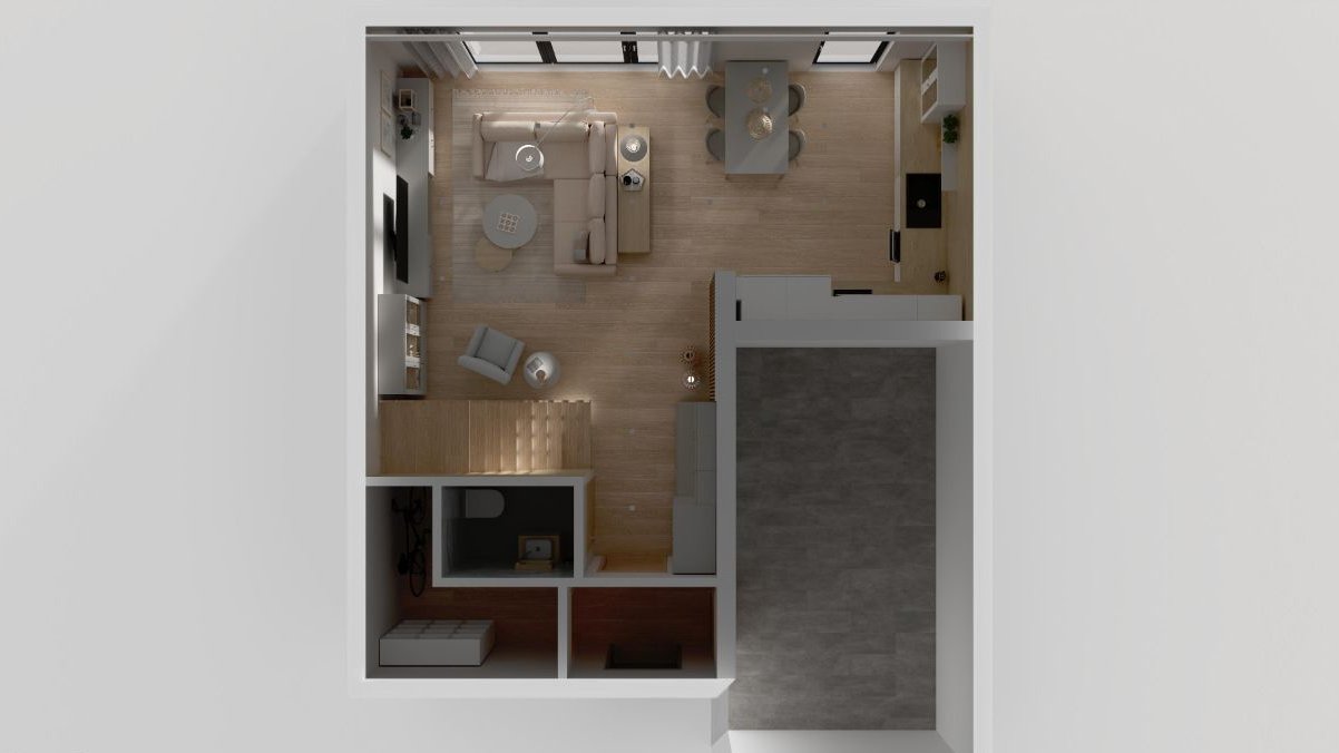 Na parterze znajduje się salon z jadalnią i aneksem kuchennym, toaleta oraz pomieszczenie gospodarcze.