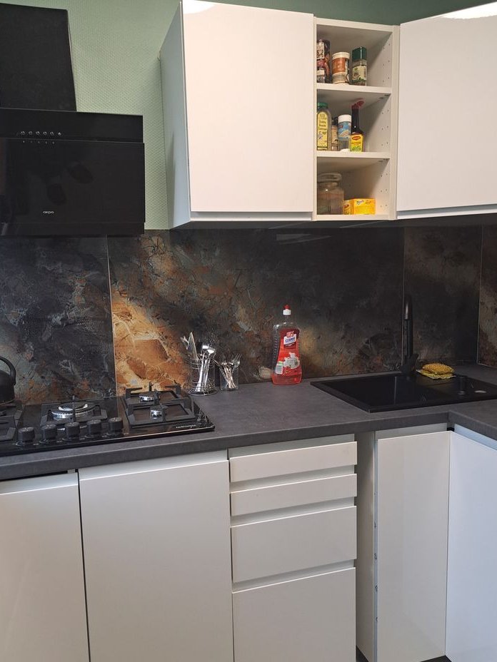 Kuchnia niemal gotowa: gres na ścianach, nowe meble kuchenne (w foliach), pełne AGD — nowe, nieużywane, na gwarancji — oraz designerski kaloryfer.
