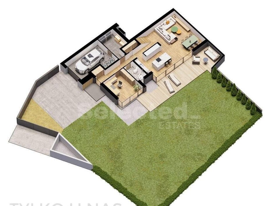 - działka zagospodarowana zielenią, ogrodzona, z przygotowanym tarasem, systemem nawadniania, podjazdem oraz miejscem na śmietniki.