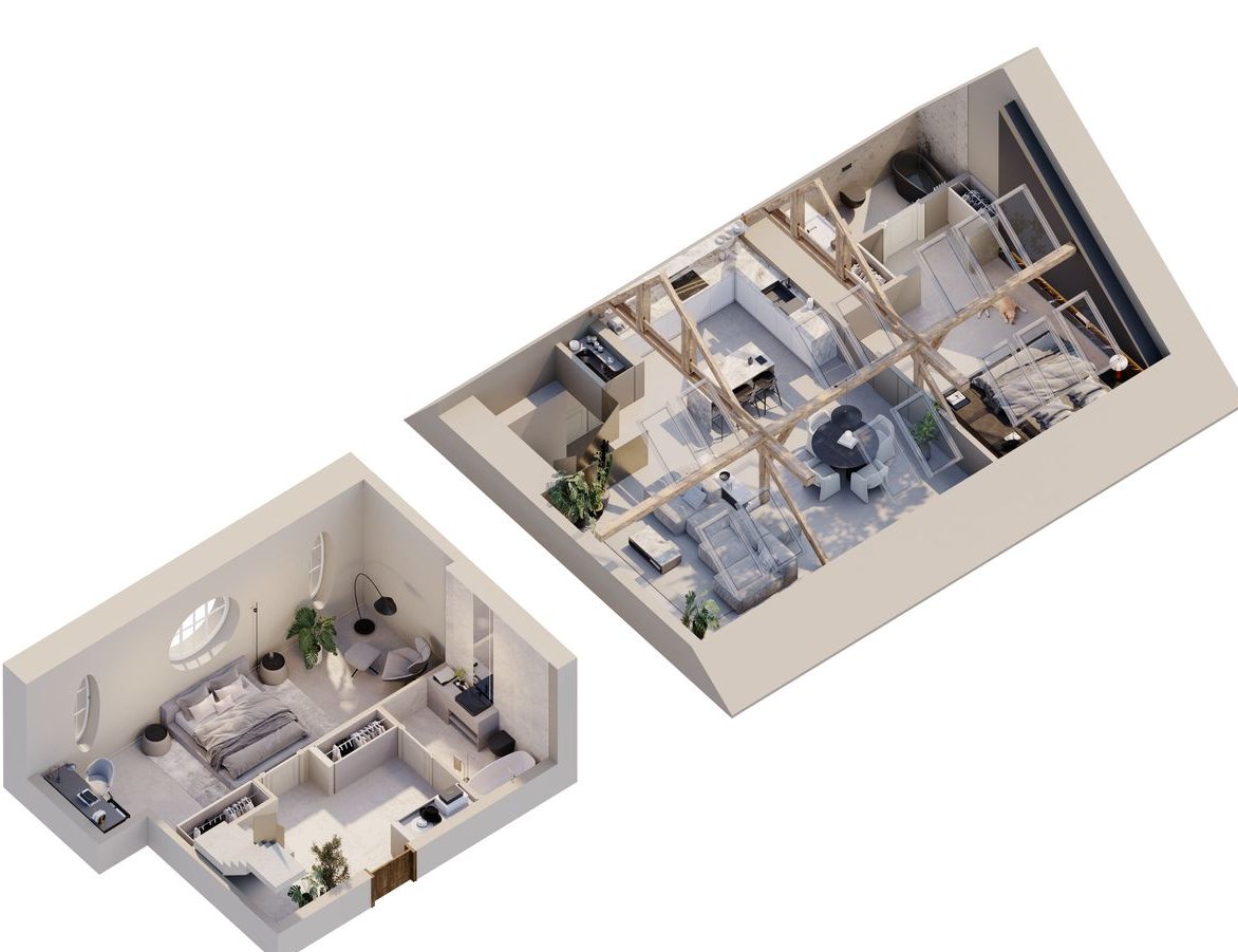 Dwupoziomowy układ apartamentu sprzyja wyraźnemu podziałowi na strefę dzienną i prywatną. Przestronne wnętrza dają duże możliwości aranżacyjne i pozwalają na pełne wykorzystanie metrażu według własnych potrzeb.