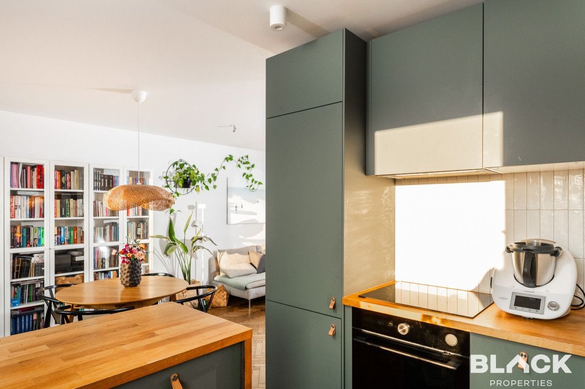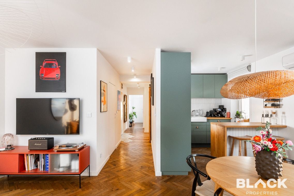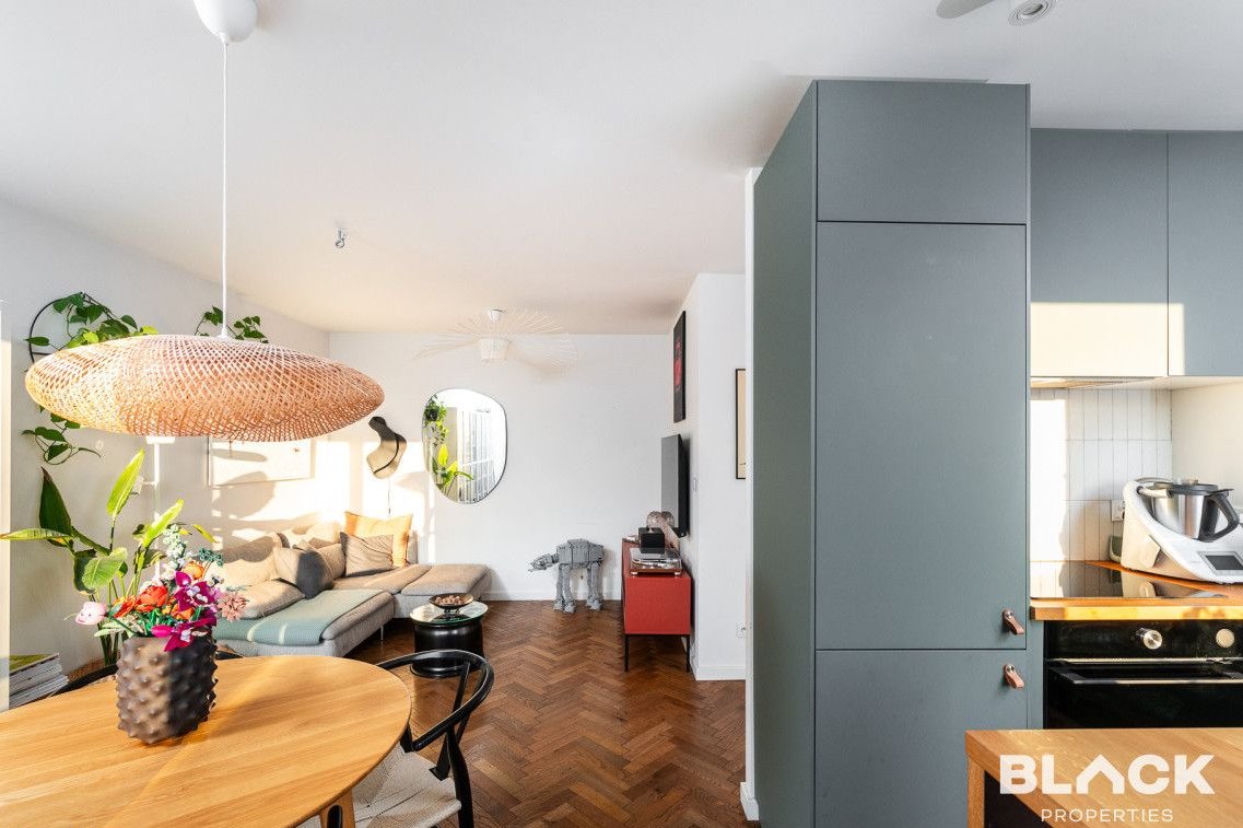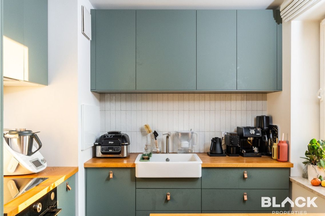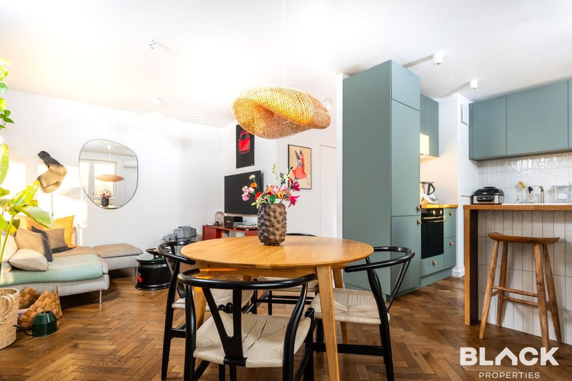 Mieszkanie trzy lata temu przeszło generalny remont. Precyzyjnie wykończone, pełne skrupulatnie wybieranych detali, łączy klasyczny sznyt z nowoczesnymi dodatkami, tworząc spójną całość. Na podłogach w całym mieszkaniu została położona drewniana deska w kuchni pojawiła się modna wyspa i lubiana butelkowa zieleń. W małej sypialni drewniana antresola zbudowana na wymiar, a w łazience efektowna złota armatura, nablatowa umywalka czy kaloryfer w kształcie plastra miodu.