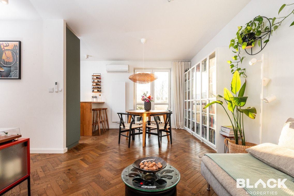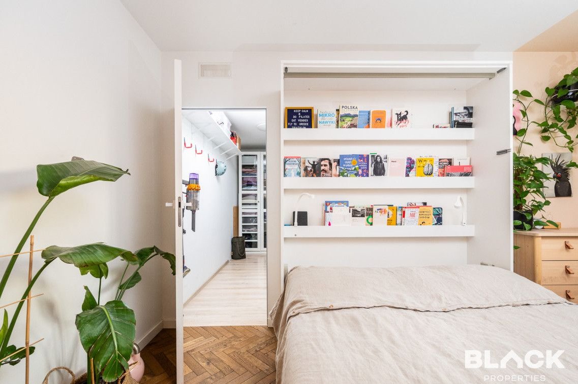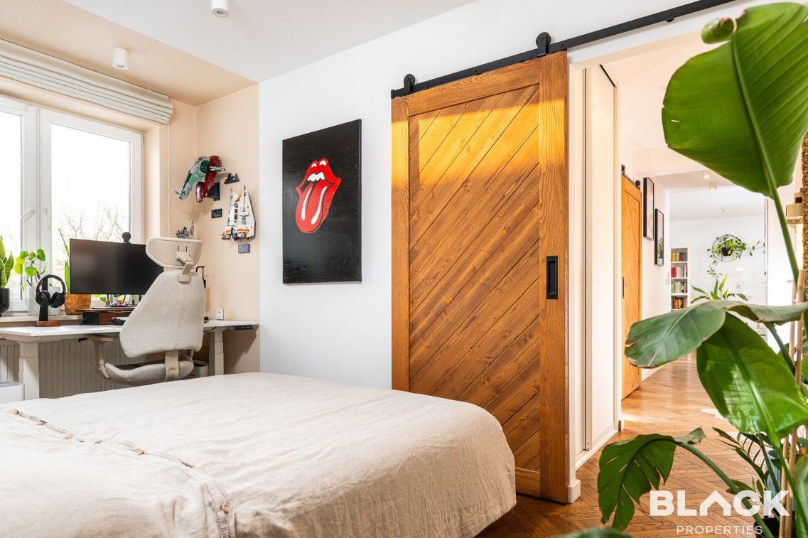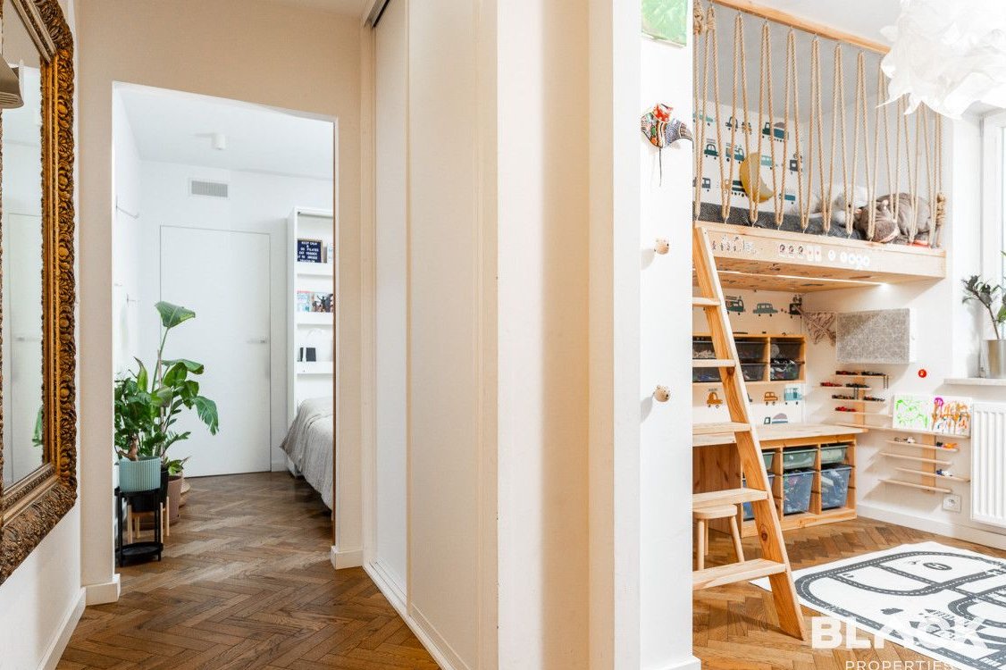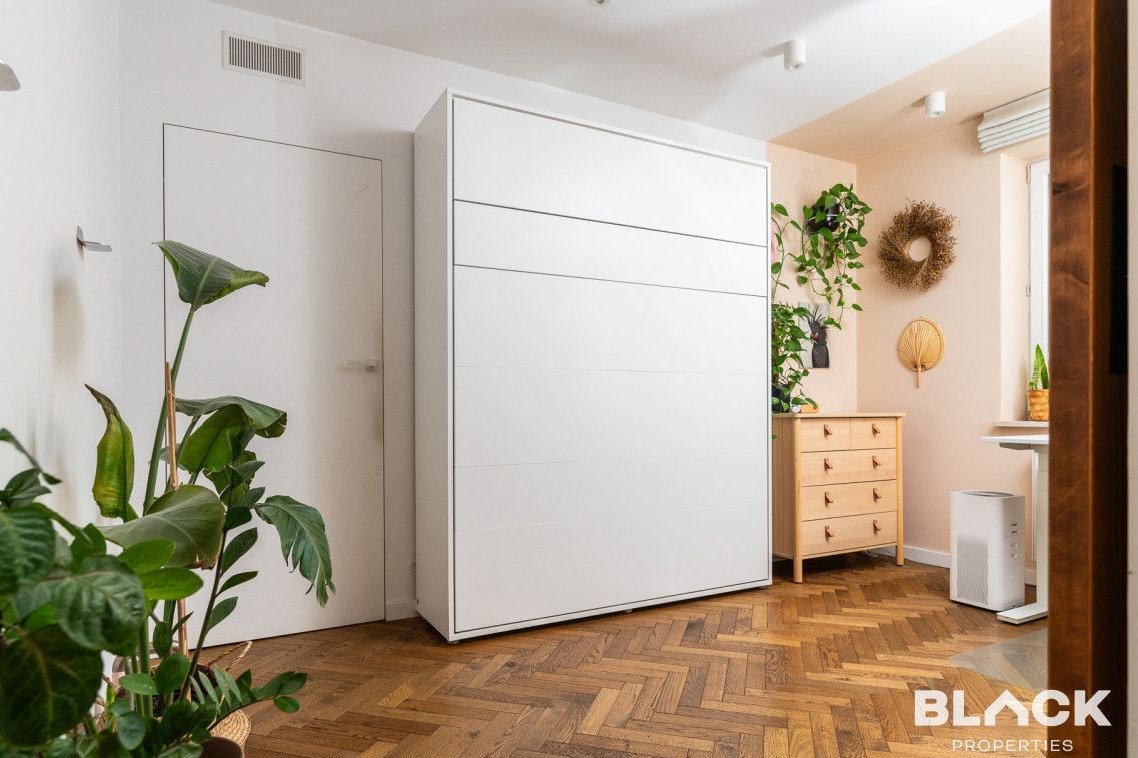 Mieszkanie trzy lata temu przeszło generalny remont. Precyzyjnie wykończone, pełne skrupulatnie wybieranych detali, łączy klasyczny sznyt z nowoczesnymi dodatkami, tworząc spójną całość. Na podłogach w całym mieszkaniu została położona drewniana deska w kuchni pojawiła się modna wyspa i lubiana butelkowa zieleń. W małej sypialni drewniana antresola zbudowana na wymiar, a w łazience efektowna złota armatura, nablatowa umywalka czy kaloryfer w kształcie plastra miodu.