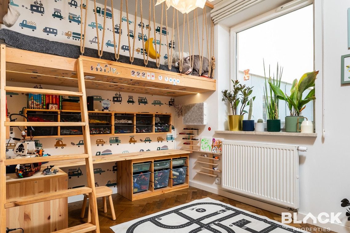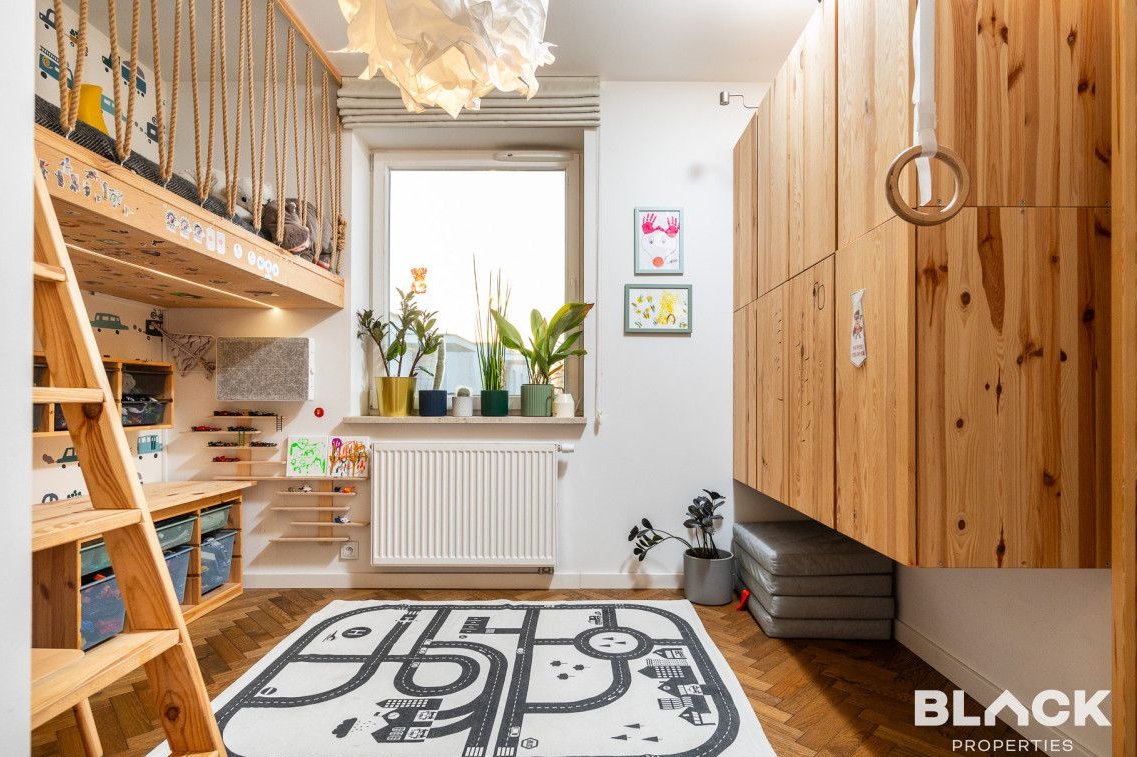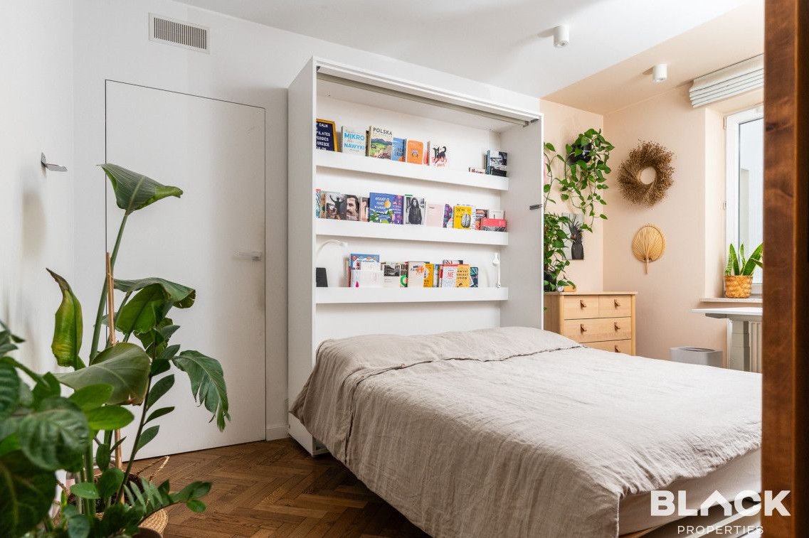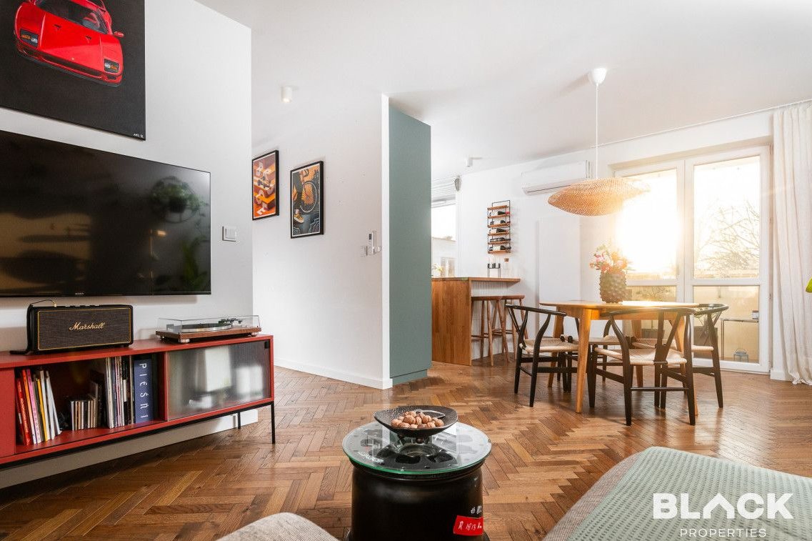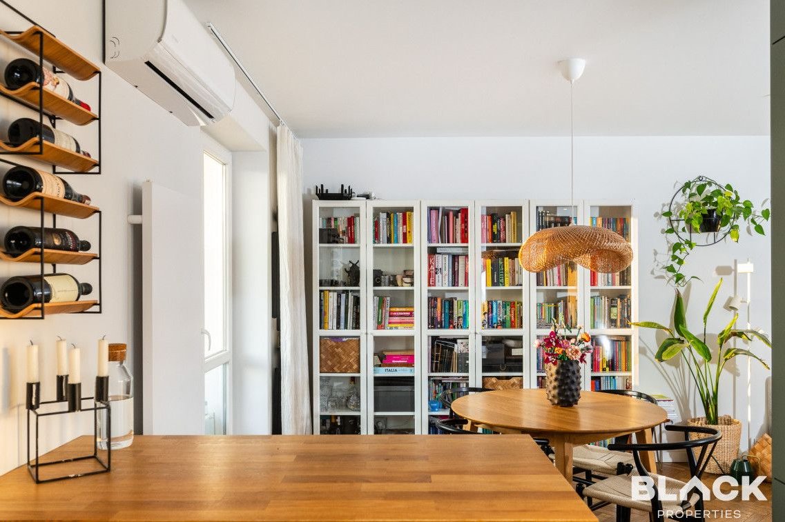 Mieszkanie trzy lata temu przeszło generalny remont. Precyzyjnie wykończone, pełne skrupulatnie wybieranych detali, łączy klasyczny sznyt z nowoczesnymi dodatkami, tworząc spójną całość. Na podłogach w całym mieszkaniu została położona drewniana deska w kuchni pojawiła się modna wyspa i lubiana butelkowa zieleń. W małej sypialni drewniana antresola zbudowana na wymiar, a w łazience efektowna złota armatura, nablatowa umywalka czy kaloryfer w kształcie plastra miodu.