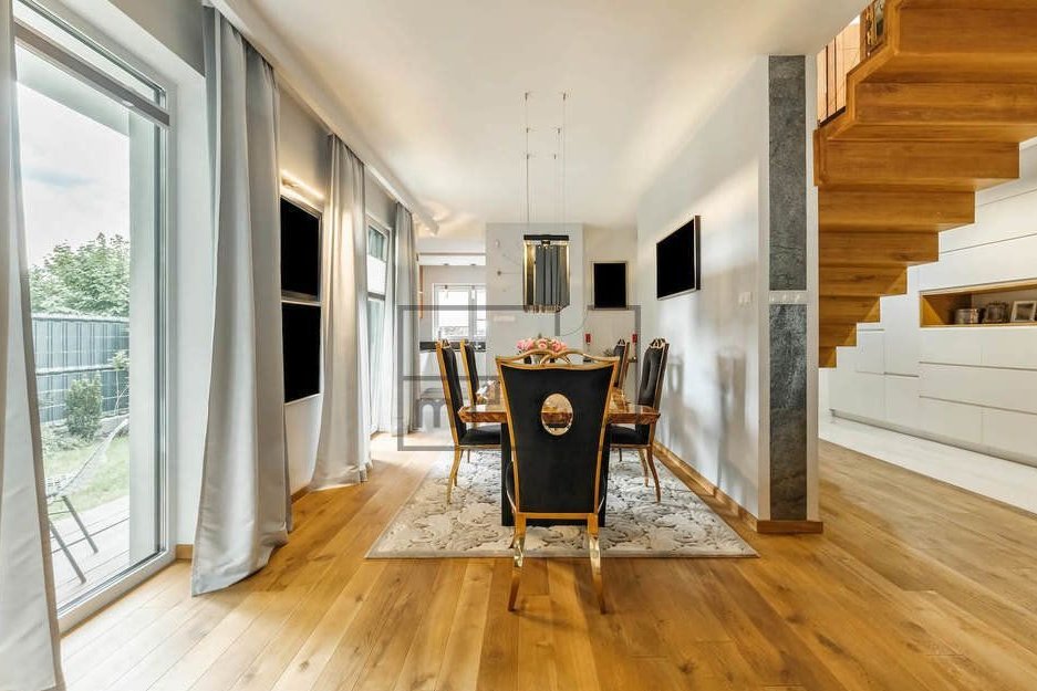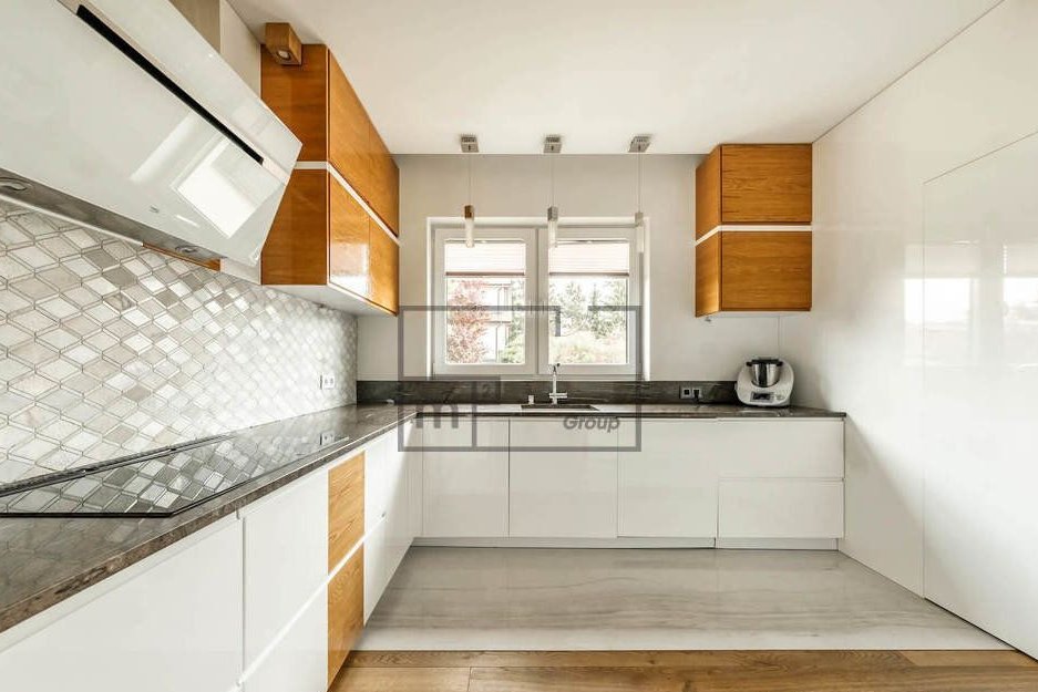 Dom wykończony w wysokim standardzie: blaty kamienne, podłoga spiek wielkoformatowy, podłogi deska dębowa, schody dębowe, armatura Villeroy Boch, biokominek Inside, stacja uzdatniania wody itd