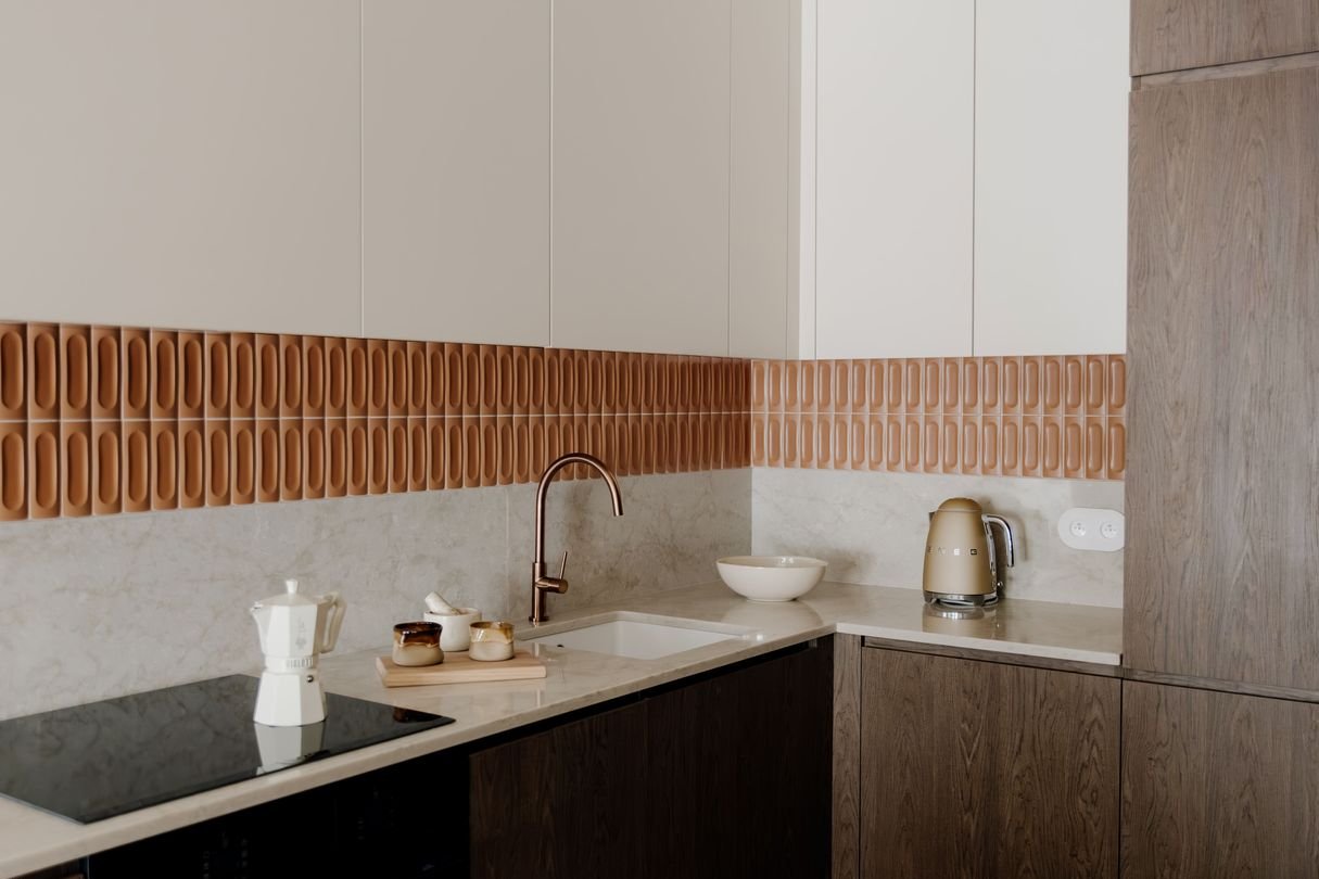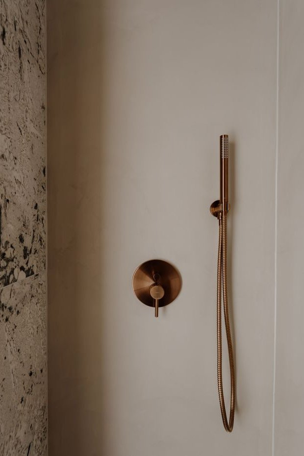 Wnętrze utrzymane zostało w duchu soft minimalizmu – ciepłego, zrównoważonego podejścia do projektowania. Drewniane podłogi marki Kaczkan, gliniane tynki Santerra, włoskie płytki Marazzi, blaty Technistone i mikrocement Festfloor tworzą wyrafinowaną, a jednocześnie ponadczasową kompozycję. Tu każdy detal pracuje na spójny efekt: elegancję, naturalność i funkcjonalność.