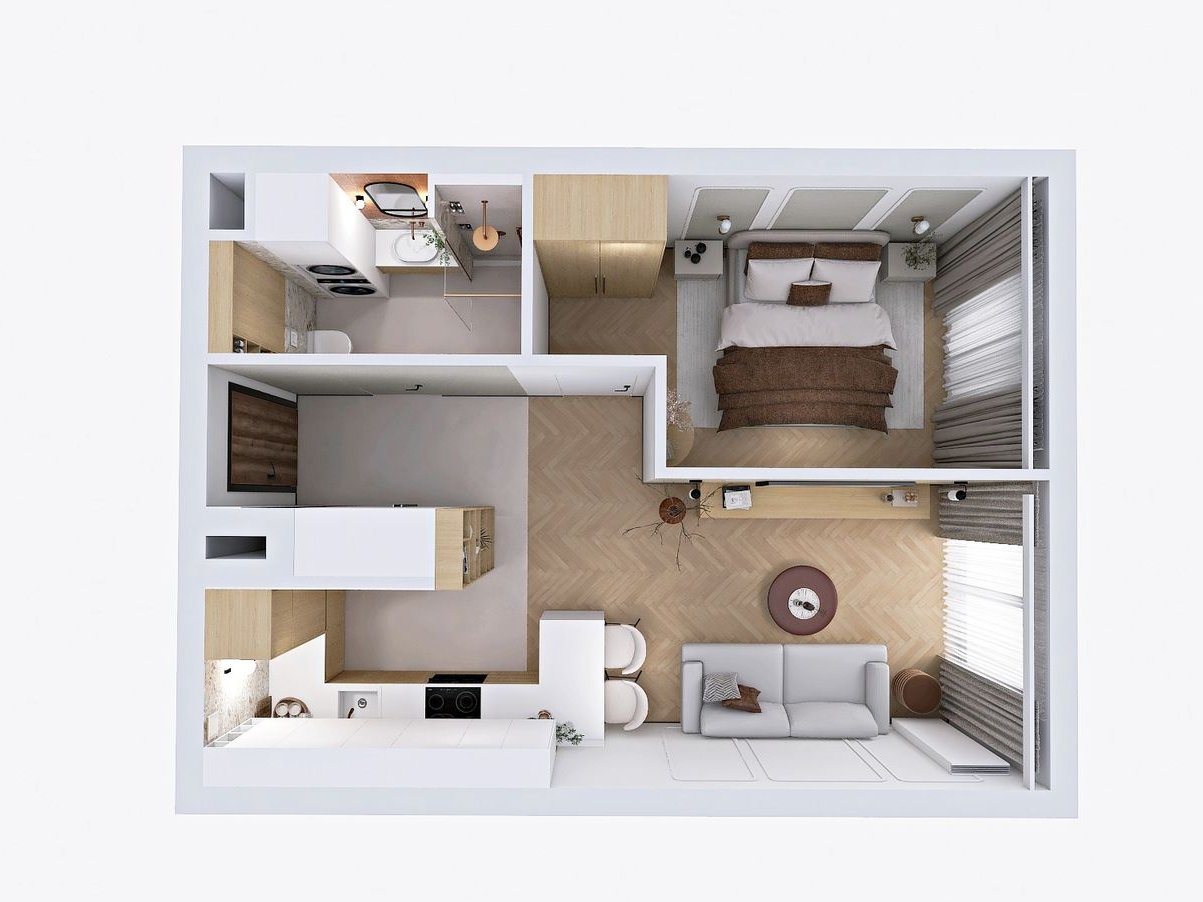 Apartament składa się z jasnego salonu z aneksem kuchennym, wydzielonej strefy sypialnianej, komfortowej łazienki z prysznicem typu walk-in oraz funkcjonalnego holu z zabudową. Wszystko dopełnia szeroki taras typu loggia o powierzchni ponad 11m2.