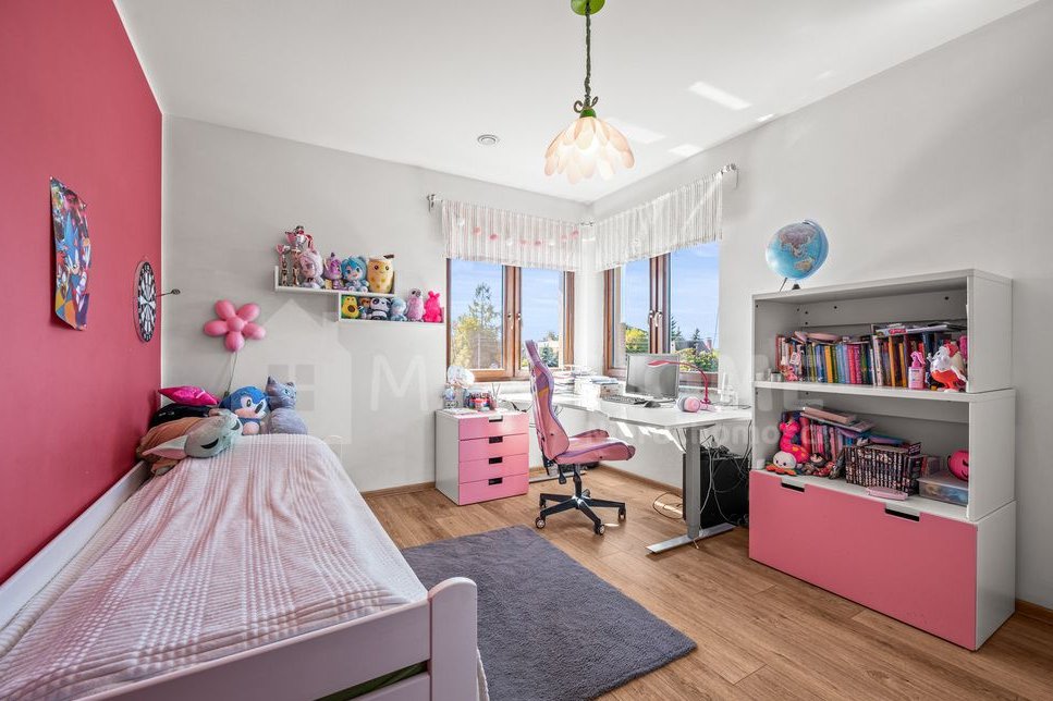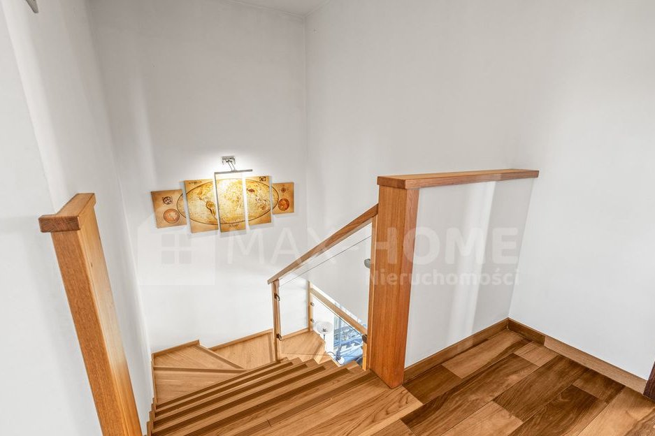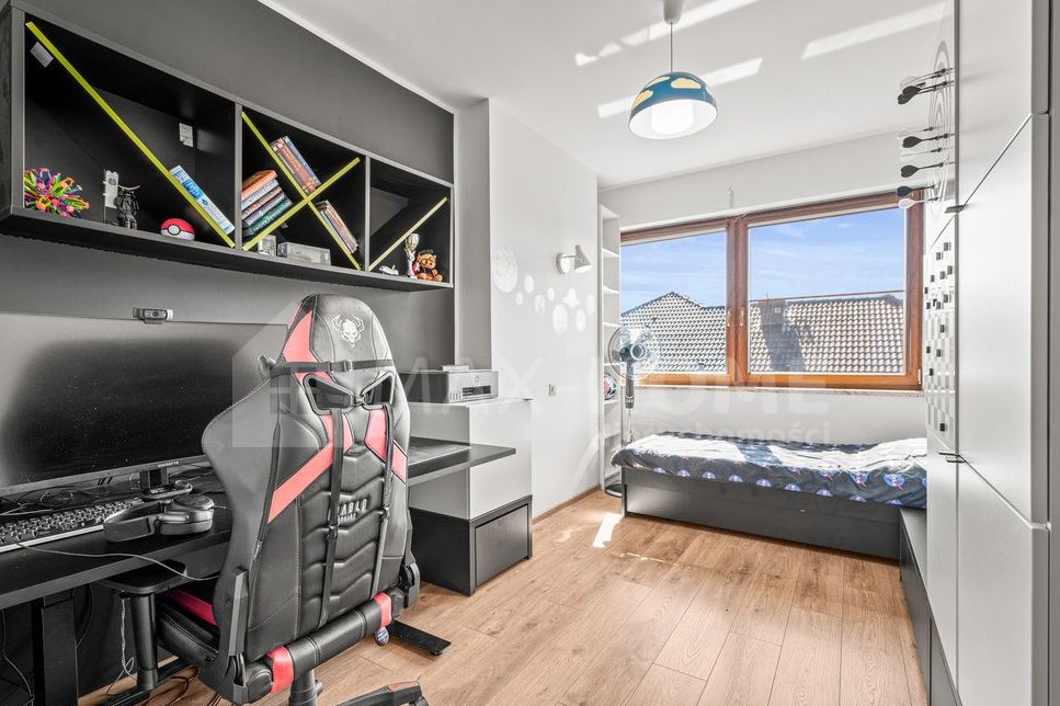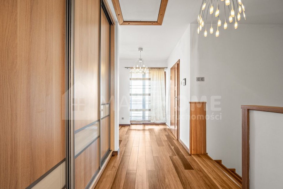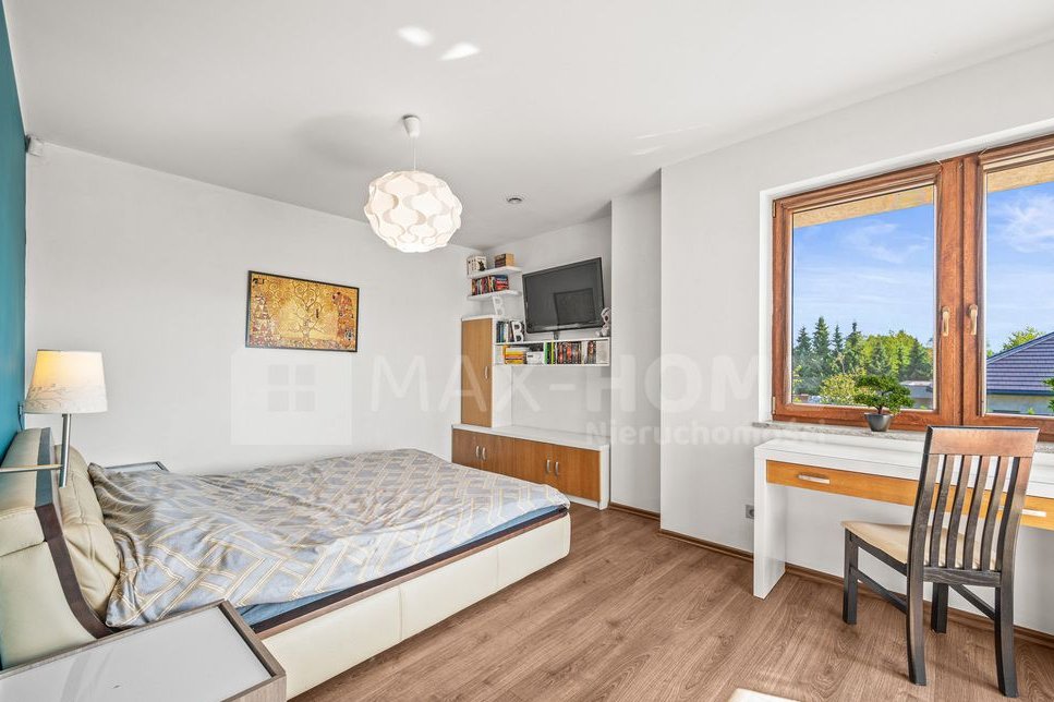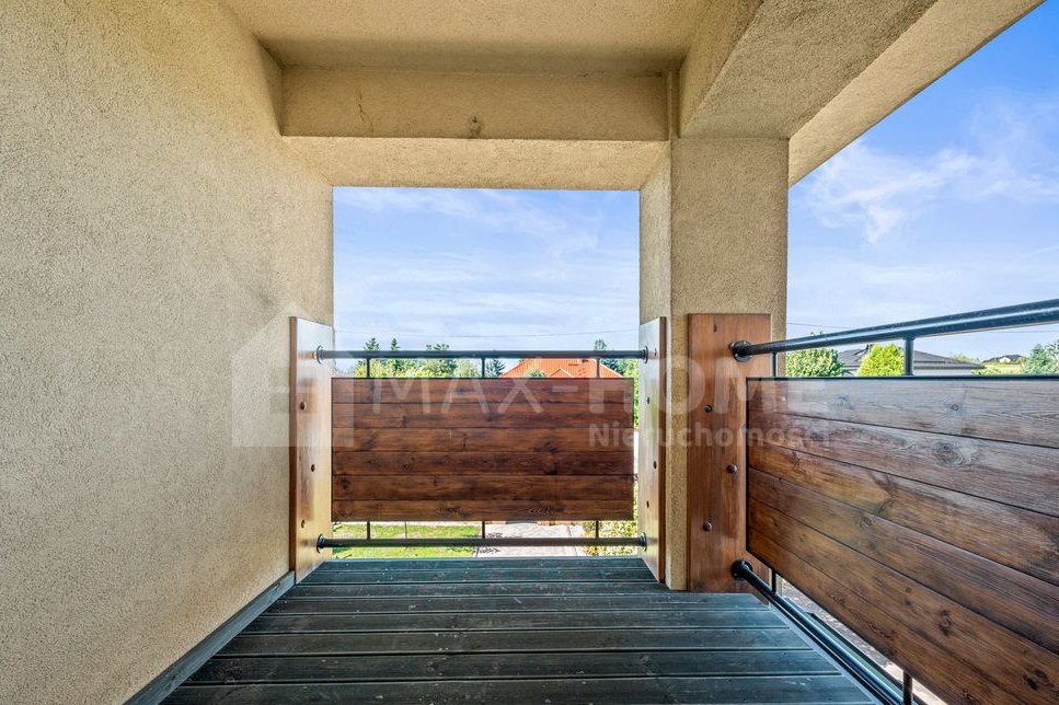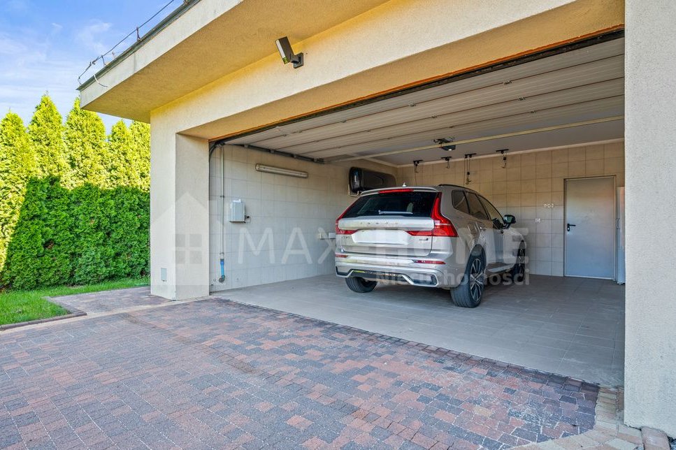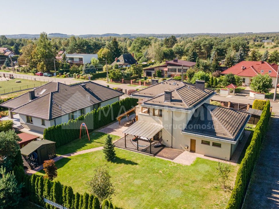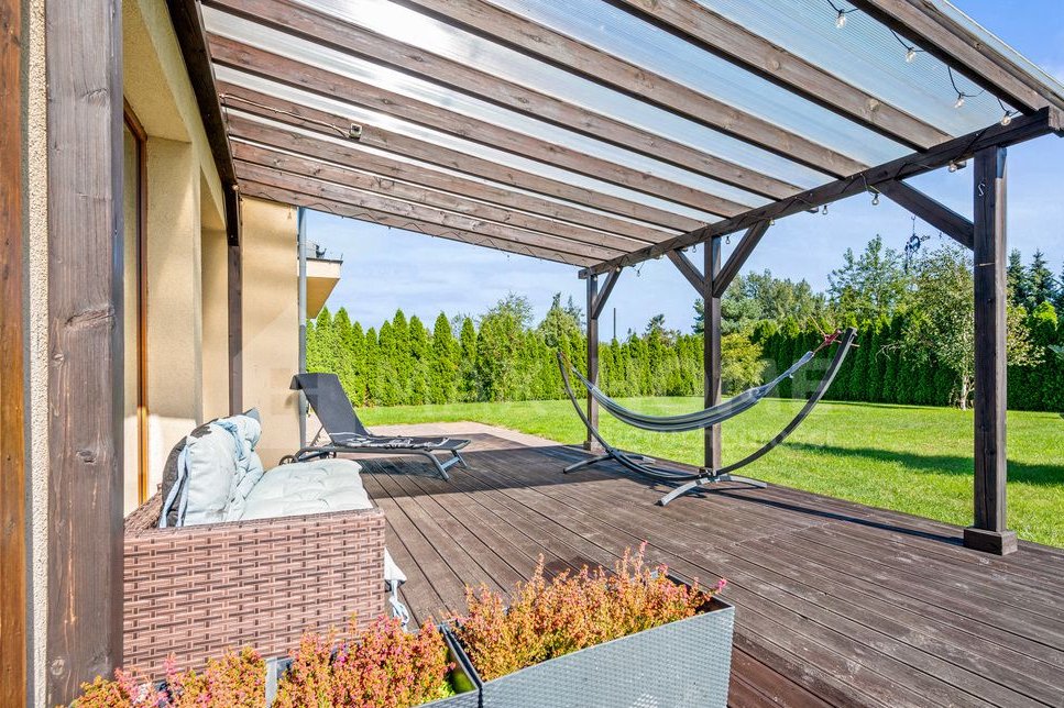 Dom znajduje się na działce o powierzchni 1195 m², w całości ogrodzonej i zagospodarowanej. Ogród otoczony jest zielenią, która tworzy naturalną barierę i zapewniaja pełną prywatność mieszkańcom. Obok domu, znajduje się również wiata z zamontowaną instalacją fotowoltaiczną na dachu, a pod nią zaaranżowana została strefa fitness z urządzeniami do ćwiczeń.