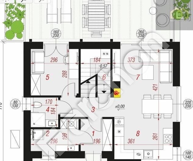 Zaplanowane pomieszczenia: Parter: - wiatrołap-3,74 m2, salon 15,34 m2, kuchnia 9,32 m2, pokój 8,28 m2, spiżarka 2,51 m2, łazienka 2,99 m2, holl 3,79, kotłownia 4,55 m2 Poddasze: komunikacja 10,50 m2, pokój 7,91 m2, pokój 7,16 m2, pokój 7,77 m2, pokój 7,37 m2, łazienka 5,72 m2, garderoba 2,17 m2