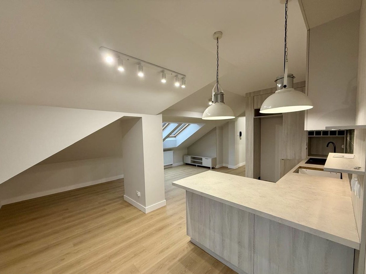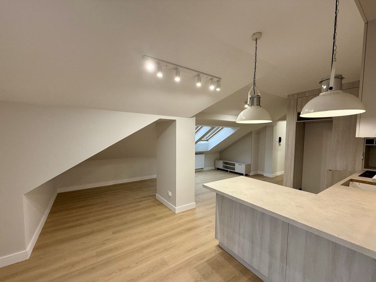 Mieszkanie zlokalizowane jest na ostatnim - 3. piętrze (budynek bez windy), ze względu na występujące w nim skosy powierzchnia po podłodze to aż 66 m², zaś obliczeniowa (do opłat administracyjnych czy podatku) to ok. 44 m². Dzięki temu mieszkanie zyskuje dużo dodatkowej przestrzeni z możliwością jej zaaranżowania.