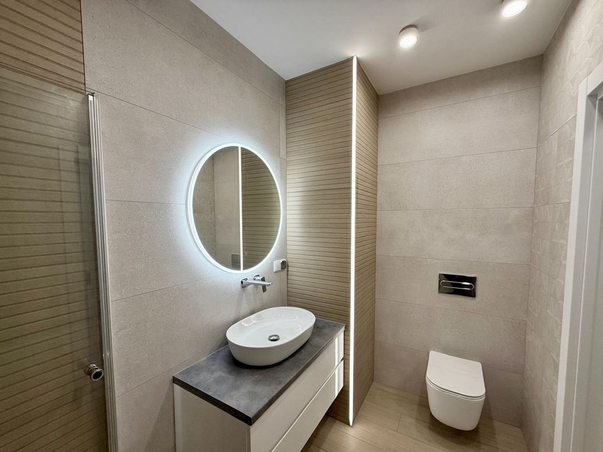 Starannie dobrane materiały wykończeniowe w neutralnej, eleganckiej kolorystyce.