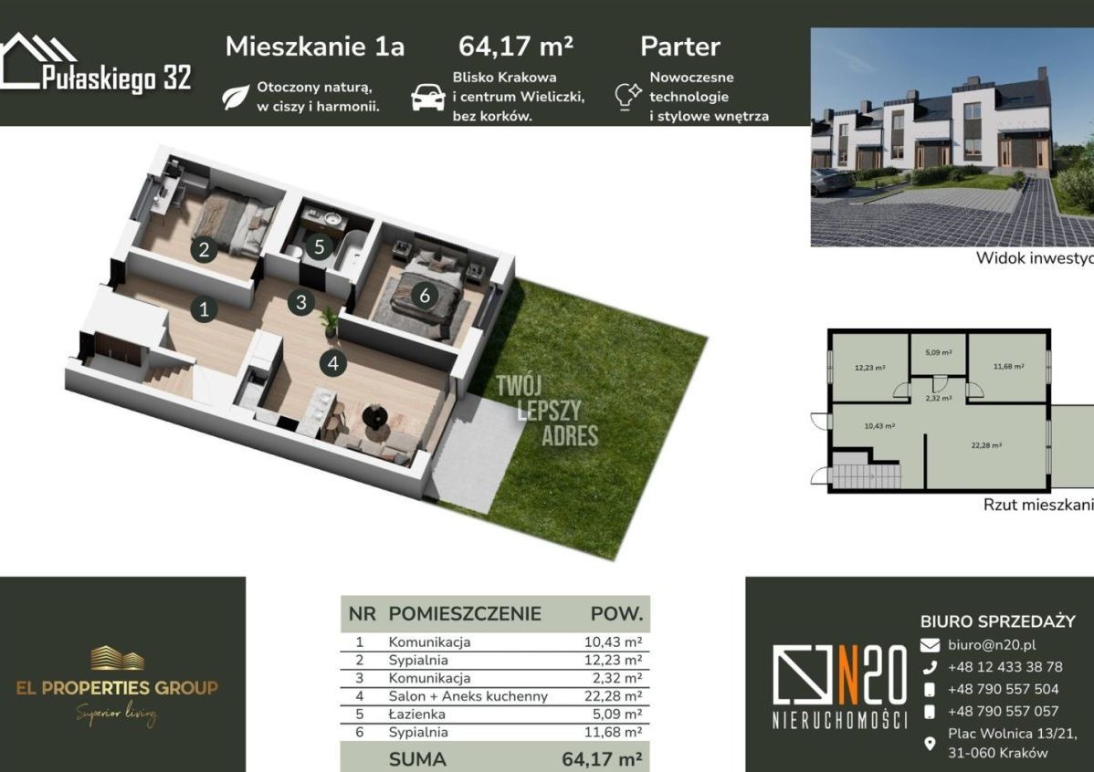 N20 Nieruchomości oferuje do sprzedaży duże mieszkania na nowym osiedlu przy ulicy Pułaskiego w Wieliczce. To idealne miejsce dla osób ceniących spokój, bezpieczeństwo i nowoczesne rozwiązania. Kameralne osiedle w swojej ofercie proponuje lokale na parterze, oraz na piętrze o powierzchni użytkowej od 61 m2 do 66 m2 z dużymi ogródkami lub balkonami.