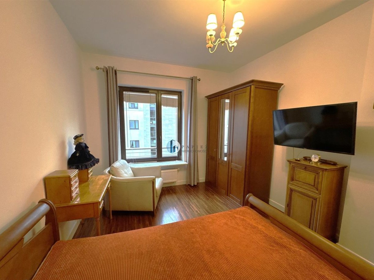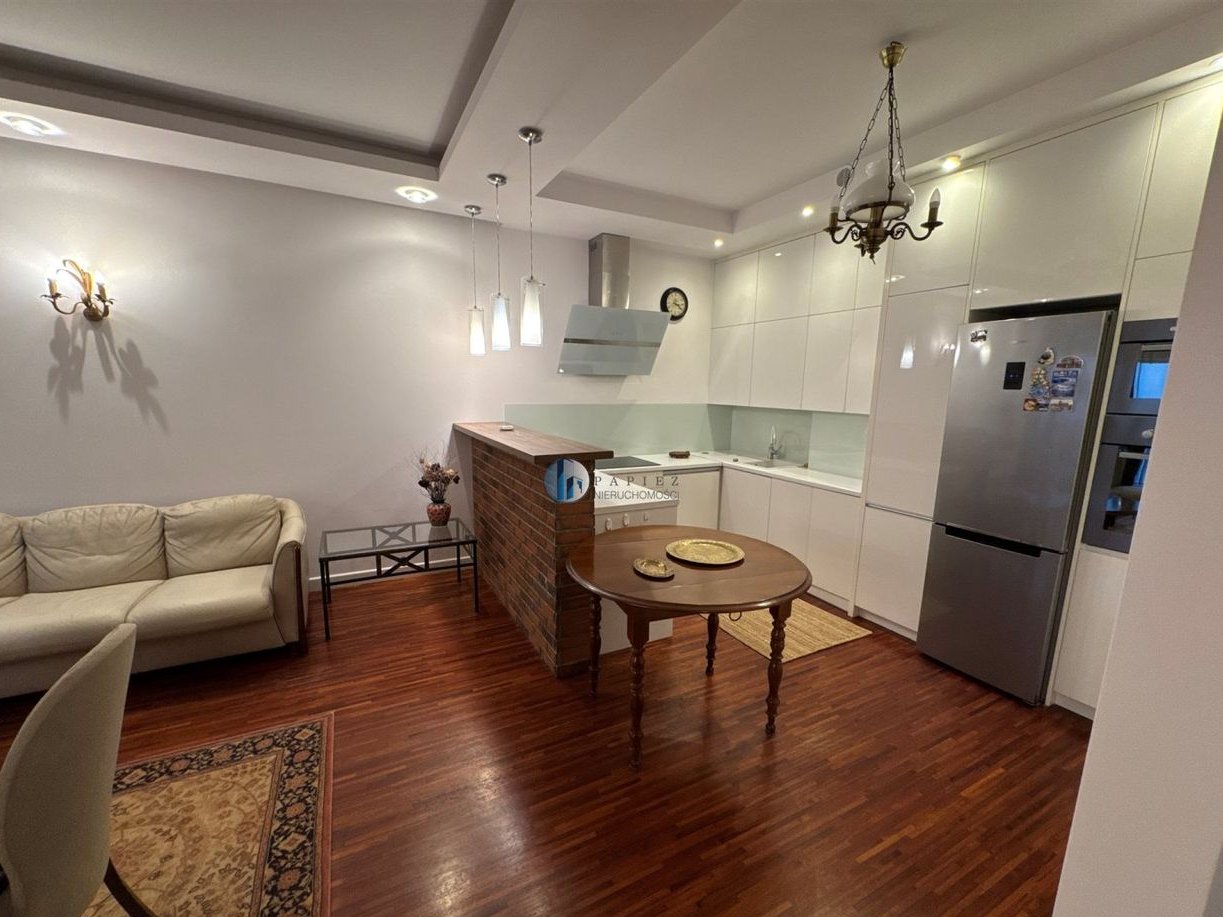 Mieszkanie bardzo ładnie urządzone, klimatyczny salon z kominkiem. Duży balkon, kuchnia częściowo otwarta na salon. Duża i ustawna sypialnia. Na podłodze w pokojach drewniany parkiet.
