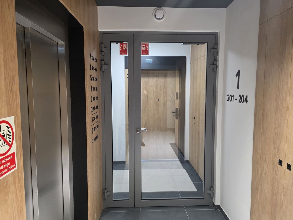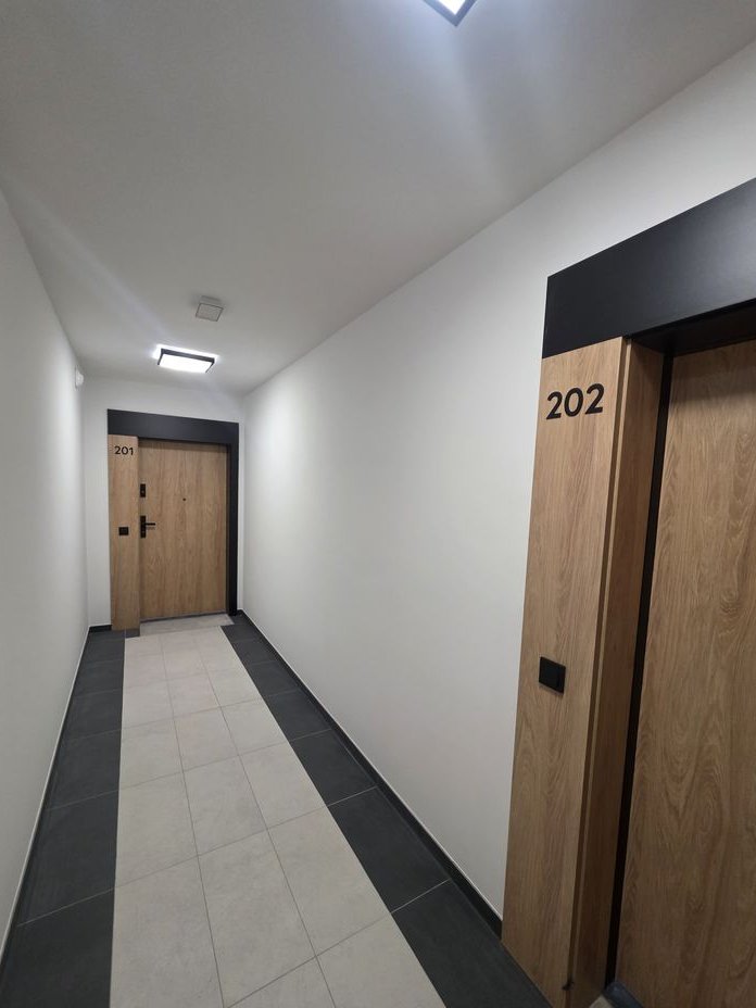 Mieszkanie na pierwszym piętrze, wejście z klatki dodatkowo zamykane na półpiętrze, duży korytarz prowadzący do mieszkania. Duży balkon prawie 10 m.