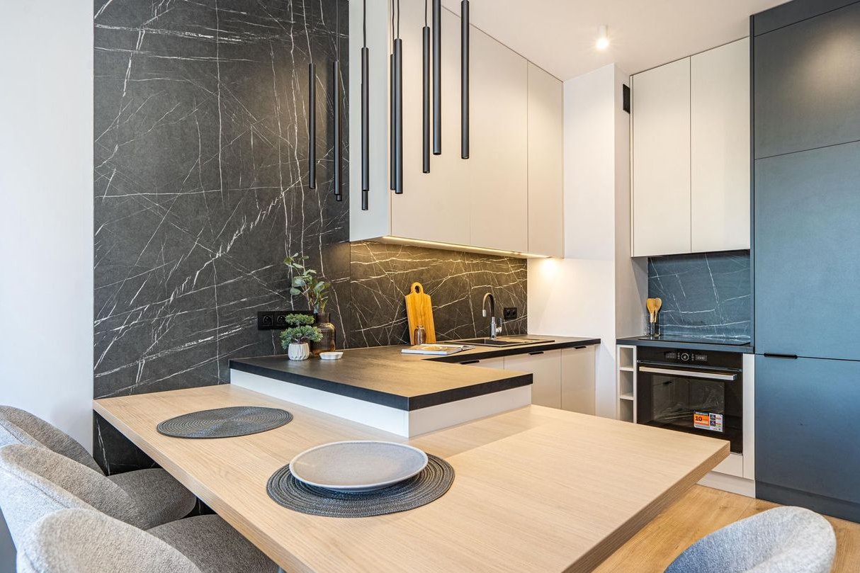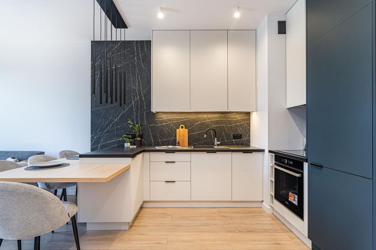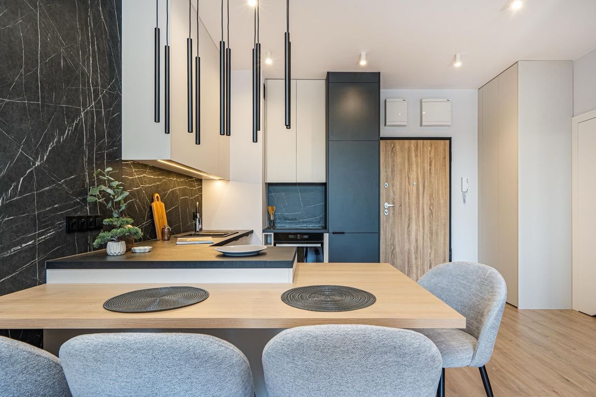 Mieszkanie jest gotowe do zamieszkania. Zostało wykończone z dbałością o detale i wyposażone w zabudowy wykonane na wymiar przez profesjonalnego stolarza: