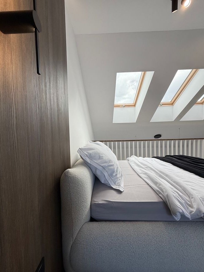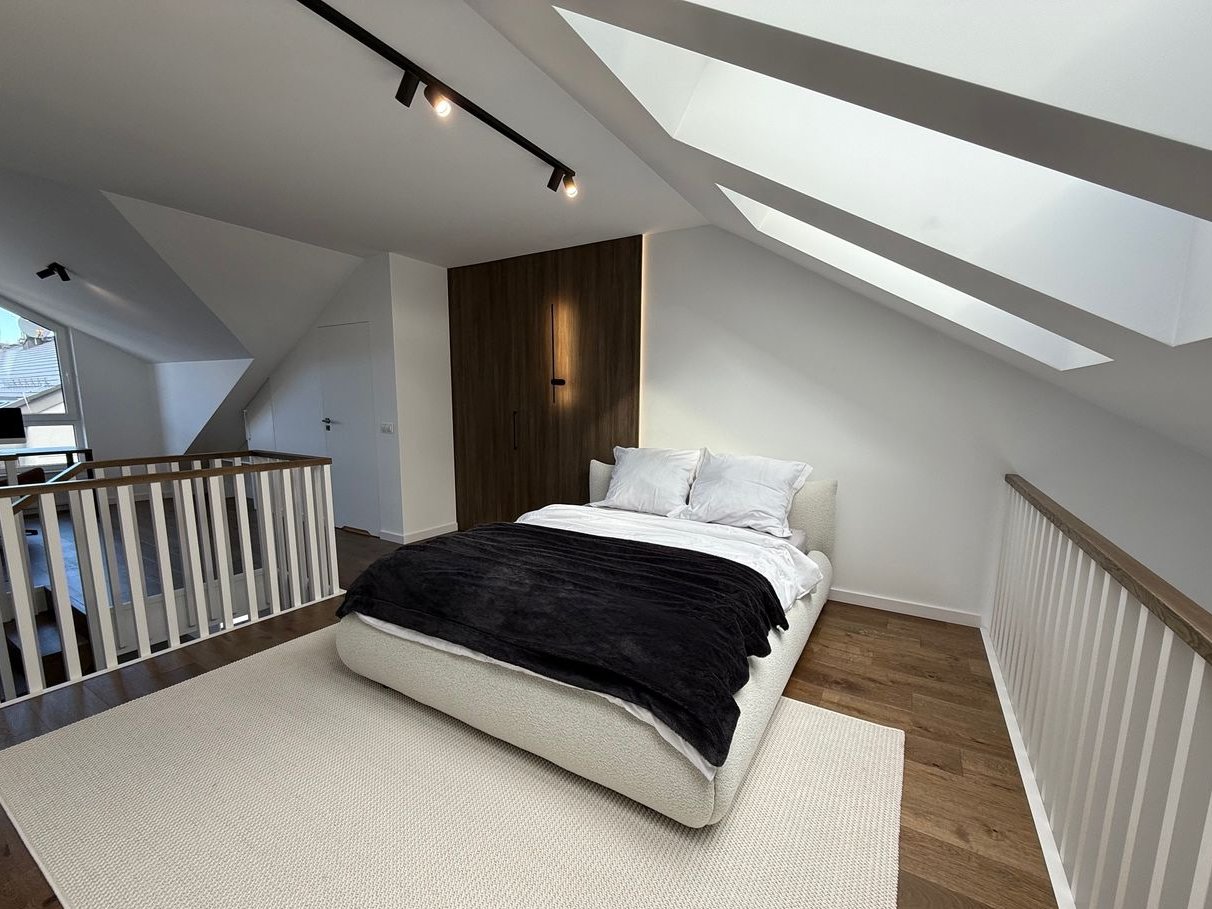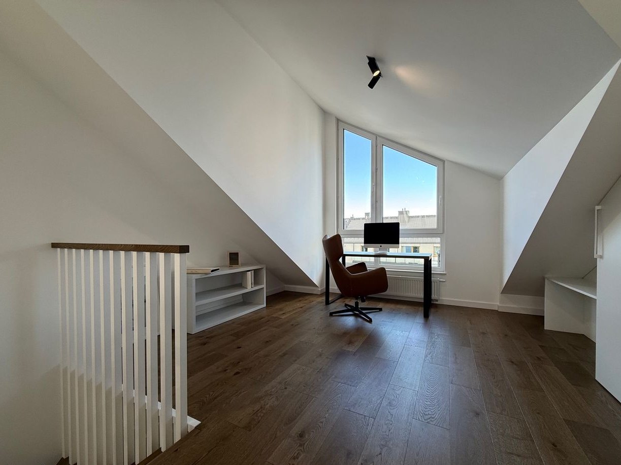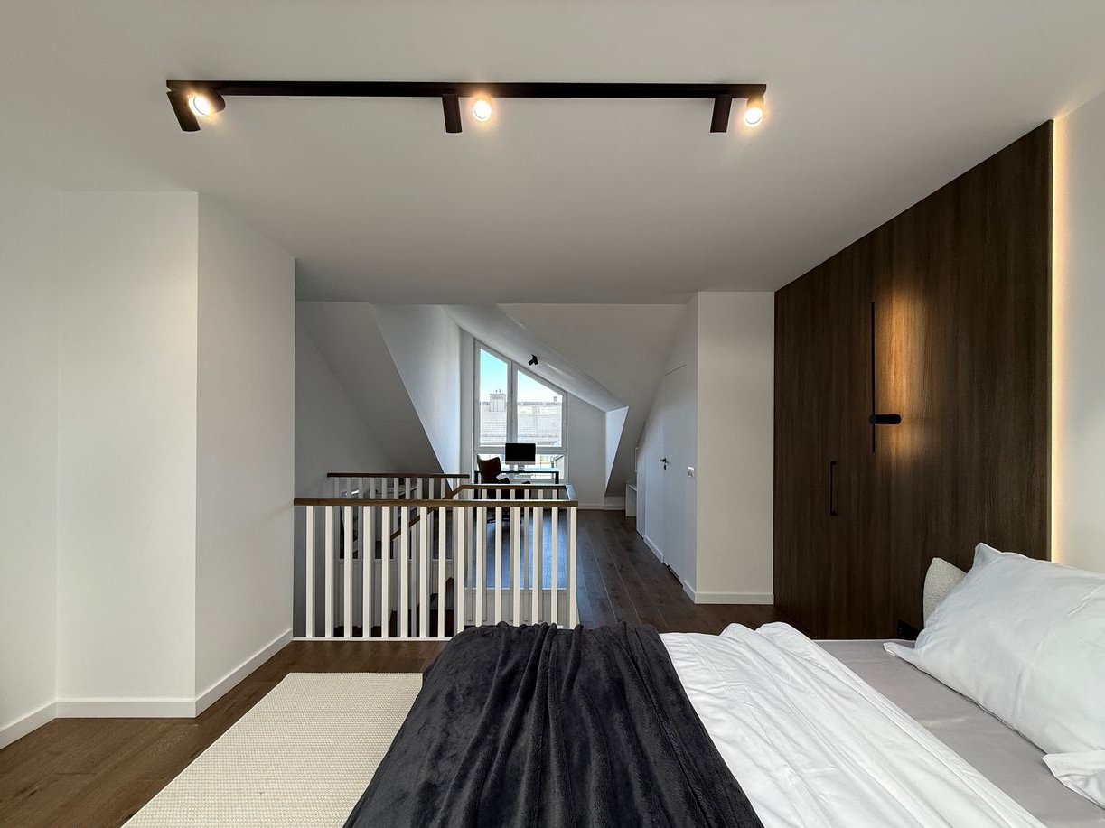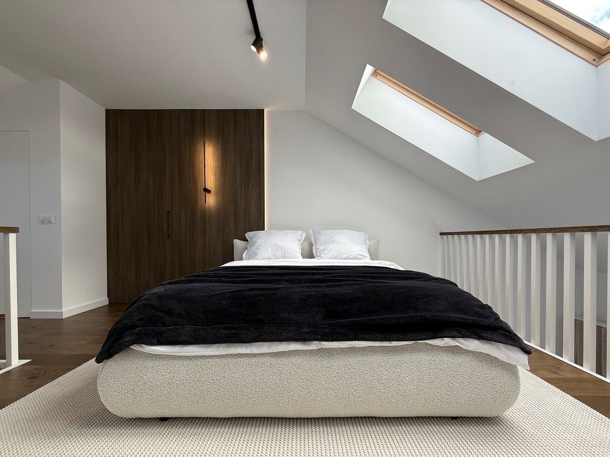 powierzchnia typu open space z częścią sypialną, garderobą i łazienką oraz część biurowo wypoczynkowa.