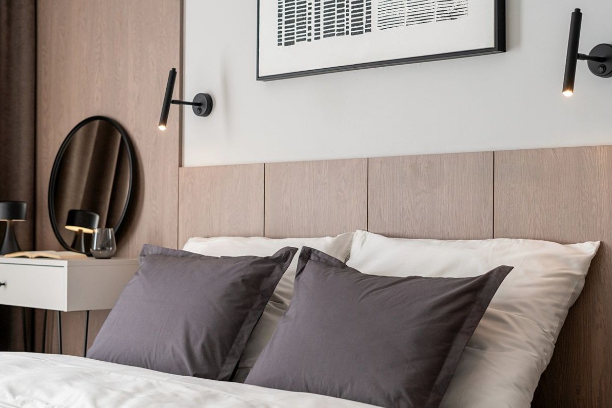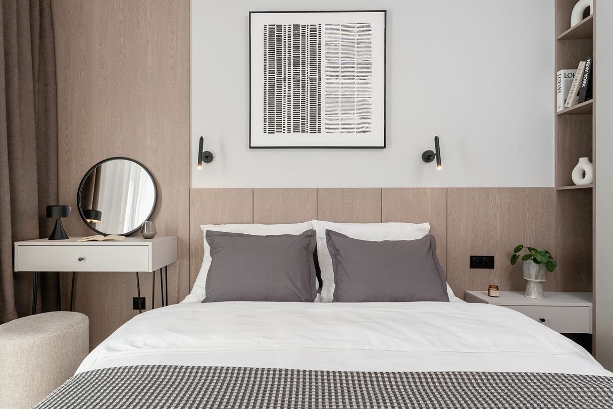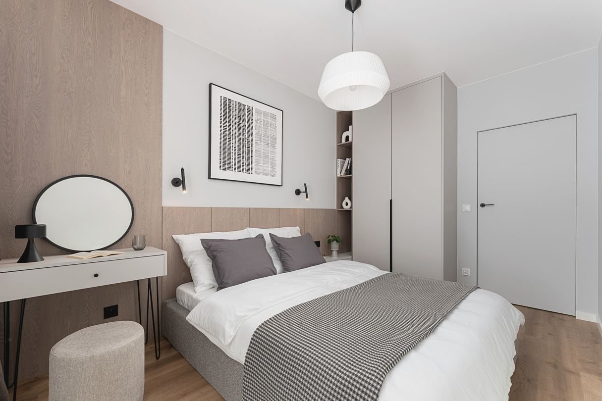 sypialnia (11,41 m²) z dużym łóżkiem i materacem, stolikiem nocnym, konsolką, pufą oraz pojemną szafą w zabudowie