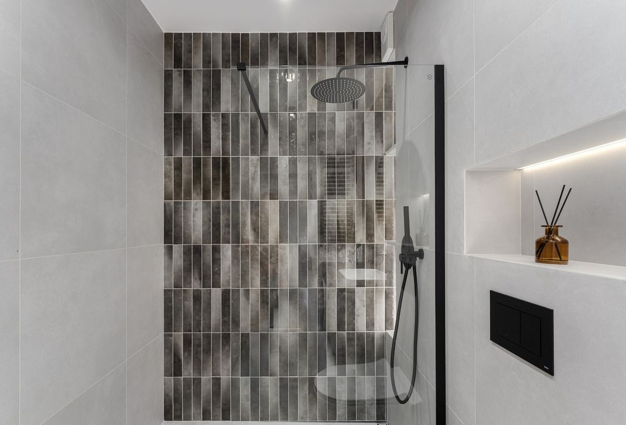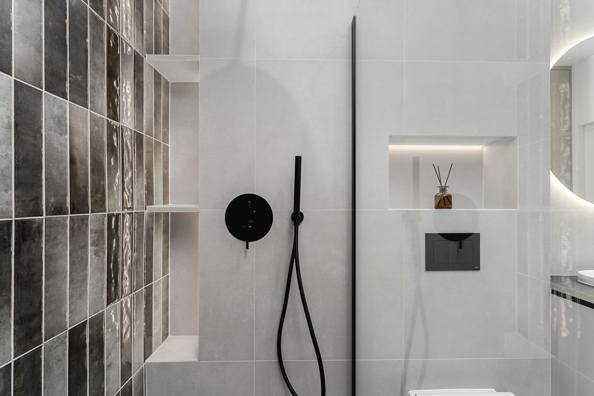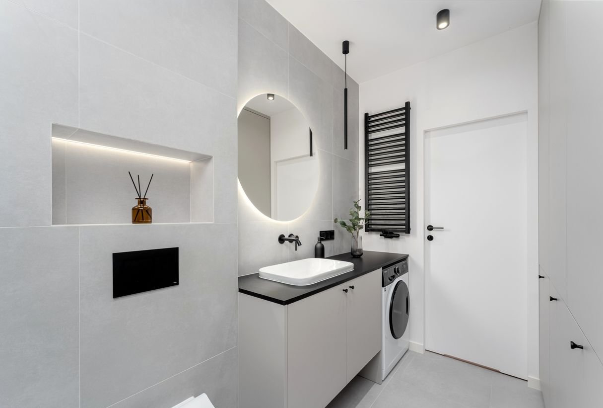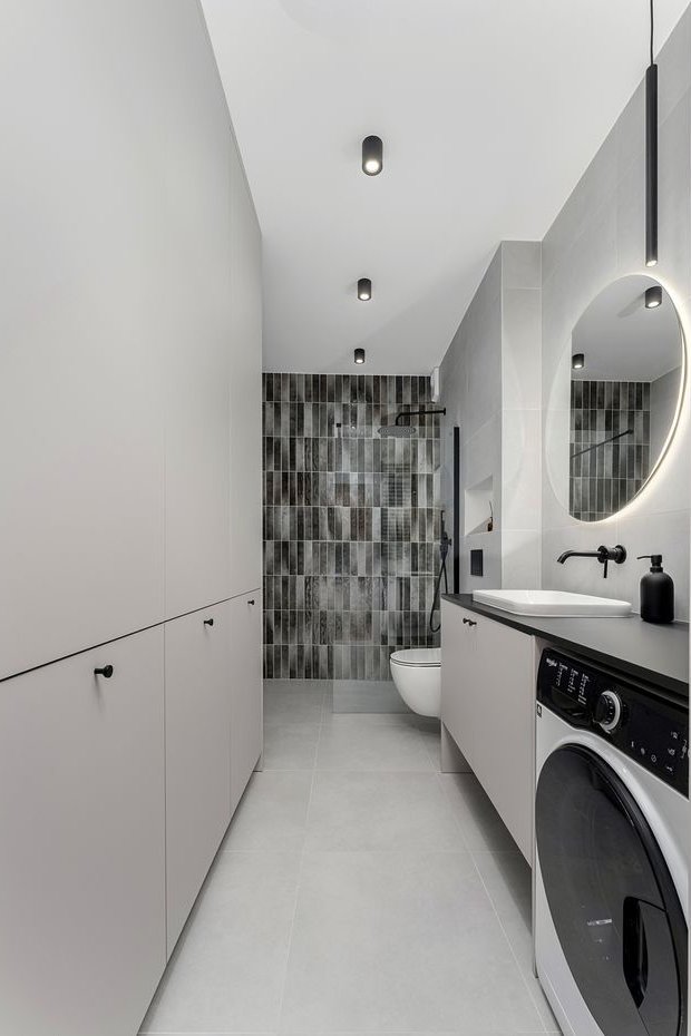 łazienka (5,91 m²) z toaletą, umywalką, prysznicem, meblami i pralką