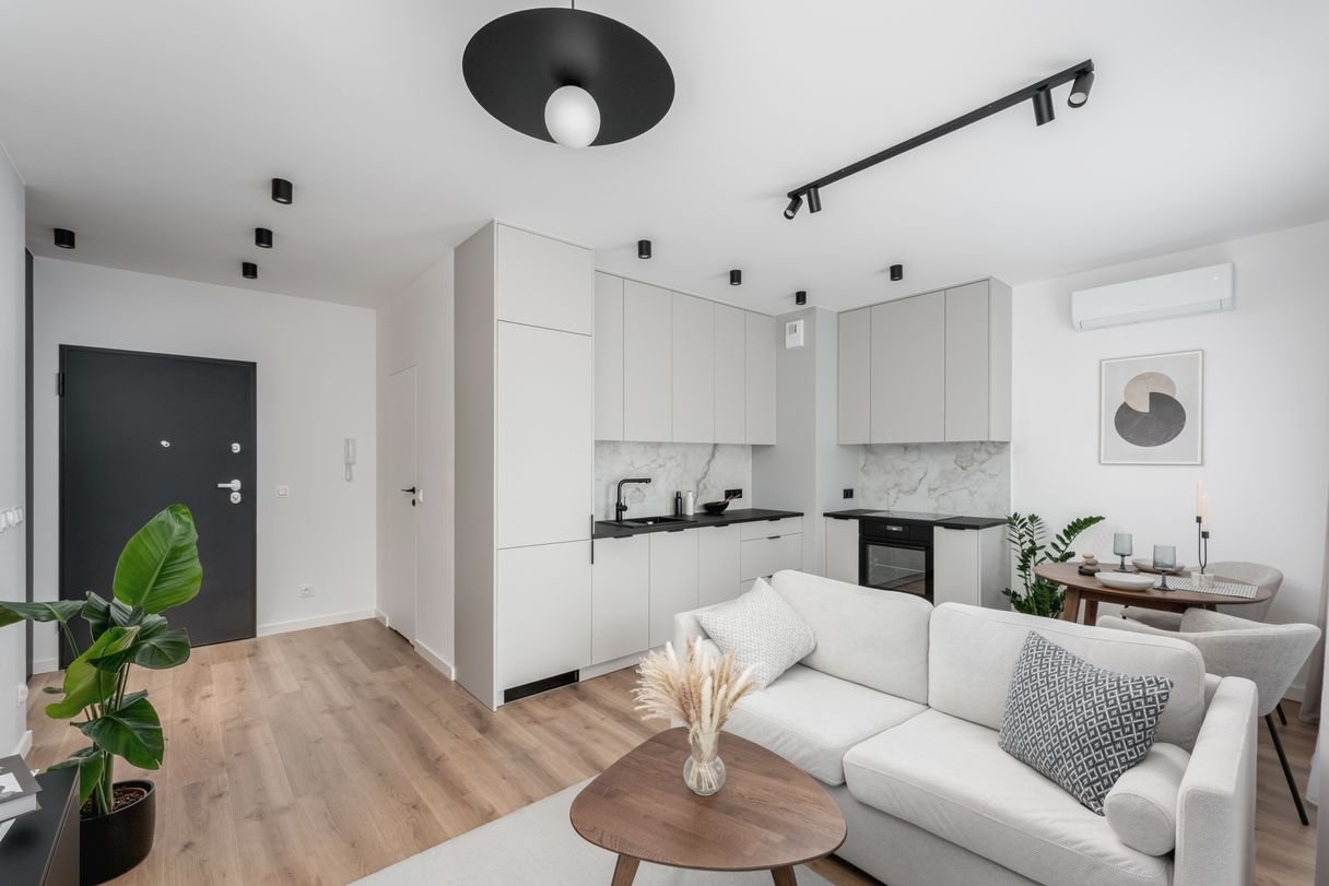 salon z aneksem kuchennym (20,80 m²), wyposażony w nowe sprzęty AGD (płyta indukcyjna, piekarnik, lodówka z zamrażarką no-frost, zmywarka, okap), meble w stałej zabudowie, rozkładaną sofę, stół z krzesłami, stolik kawowy i dodatki