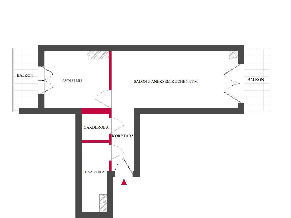 Funkcjonalny układ pomieszczeń z garderobą zapewniający wygodę codziennego użytkowania i przechowywania.