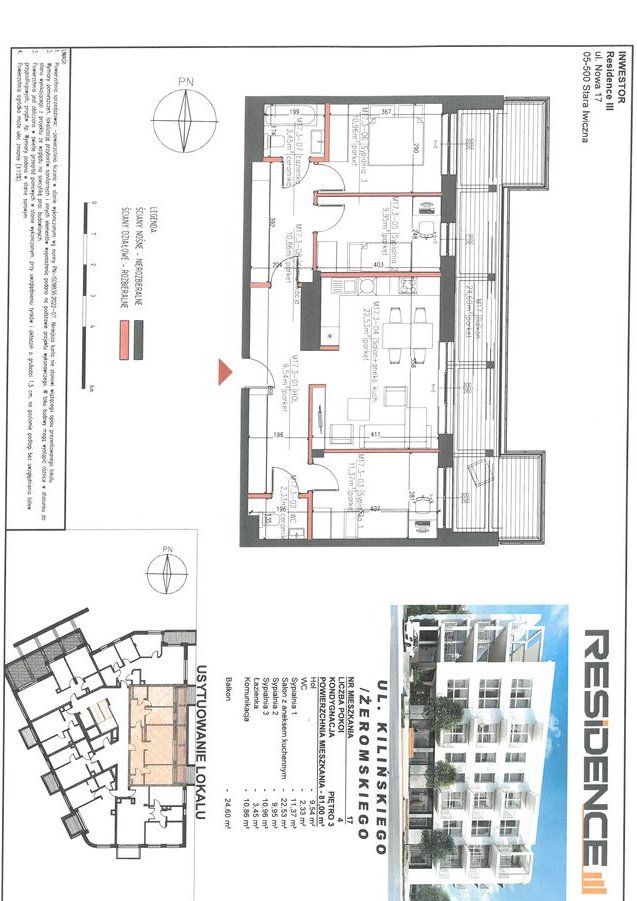 Nowy budynek wielorodzinny przy ul. Kilińskiego 3 w centrum Piasecznia. Mieszkanie 4 pokojowe nr 17 składa się z holu, salonu z aneksem kuchennym (23 mkw), 3 pokoje (11,37 mkw, 10 i 11mkw), łazienki (3,45mkw) i WC(2,33 mkw). Do mieszkania przynalezy duży balkon 24,60 mkw. Budynek w stylu kamiennicy z windą. Zakończenie budowy lipiec 2026r.