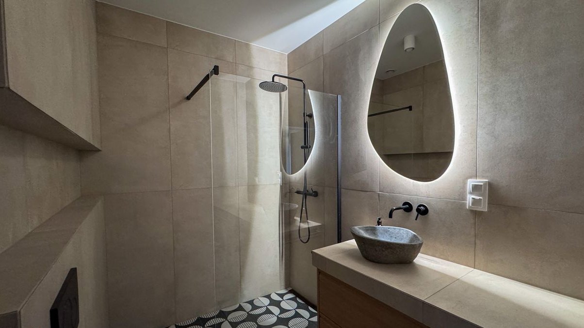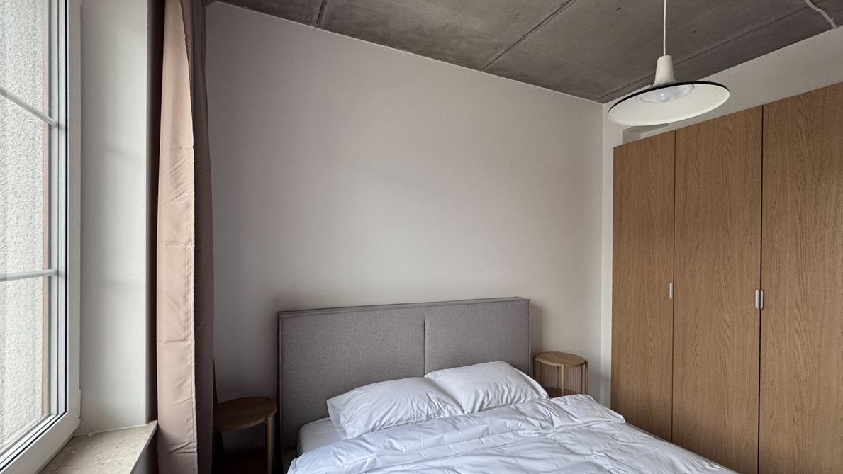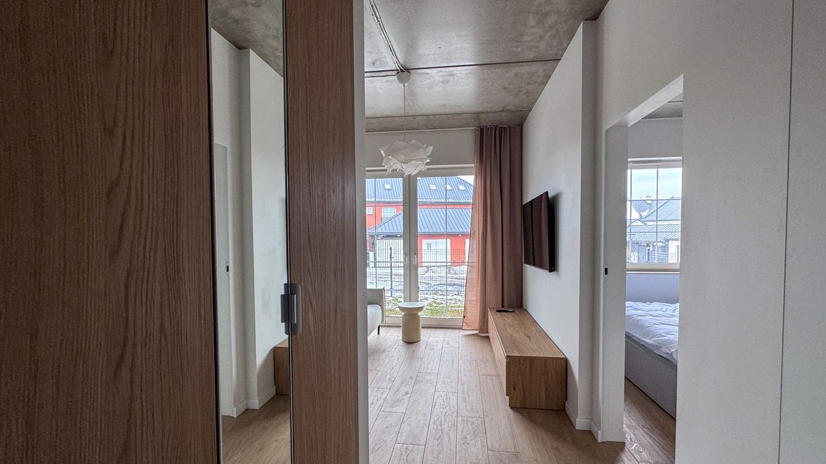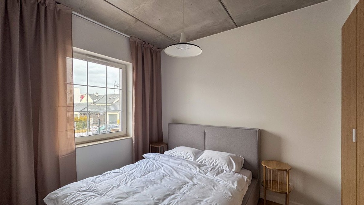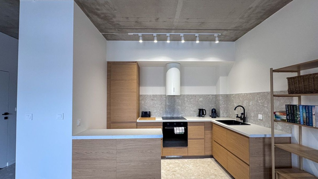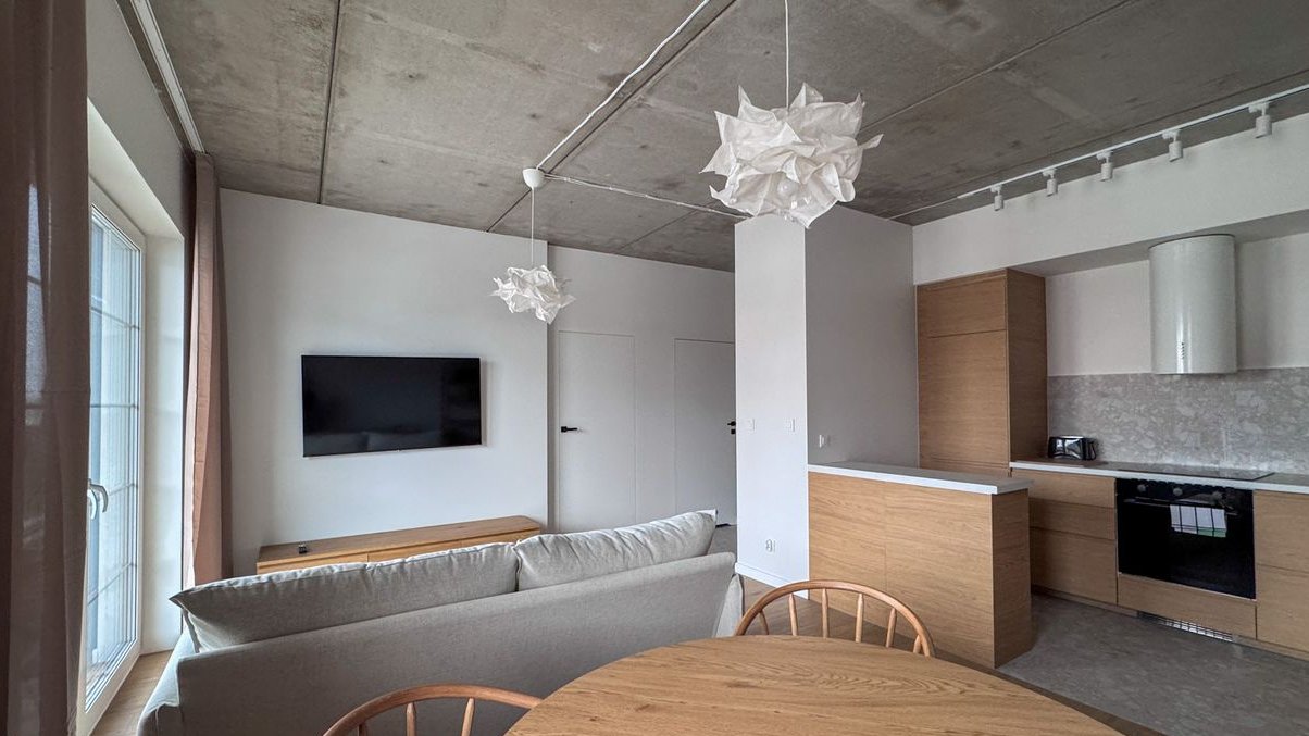 Mieszkanie zostało zaprojektowane funkcjonalnie i stylowo. Pozostawiono oryginalne, betonowe sufity. Na podłogach płytki - ogrzewanie podłogowe w całym mieszkaniu. Zamontowane zostały drzwi ukryte do sypialni i łazienki tworząc jednolitą całość w mieszkaniu.