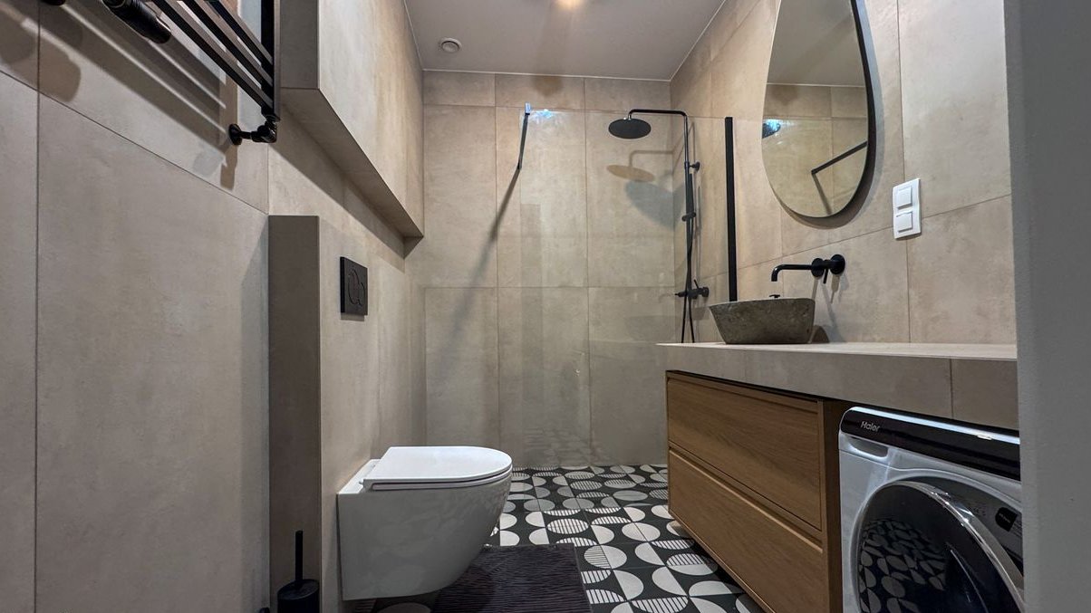 łazienka z WC, prysznicem typu walk-in i pralką,