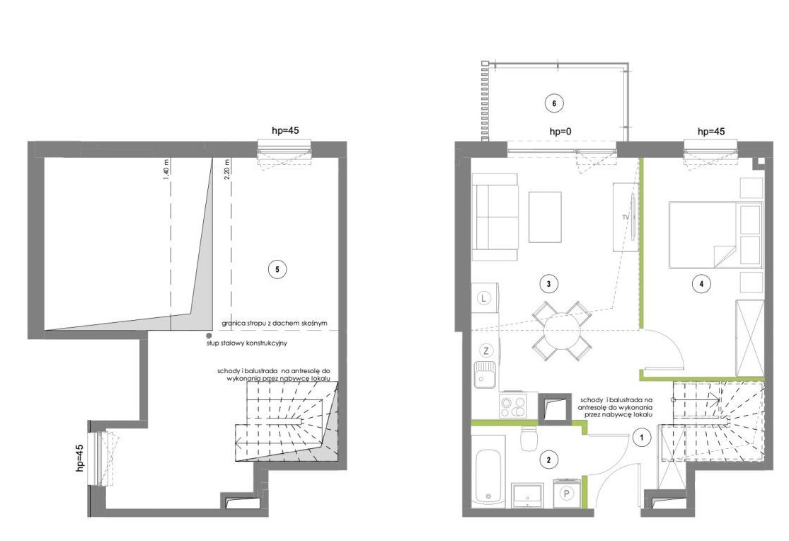 Antresola pozostaje do własnej aranżacji — z możliwością stworzenia dodatkowej sypialni, gabinetu lub przestrzeni rekreacyjnej.