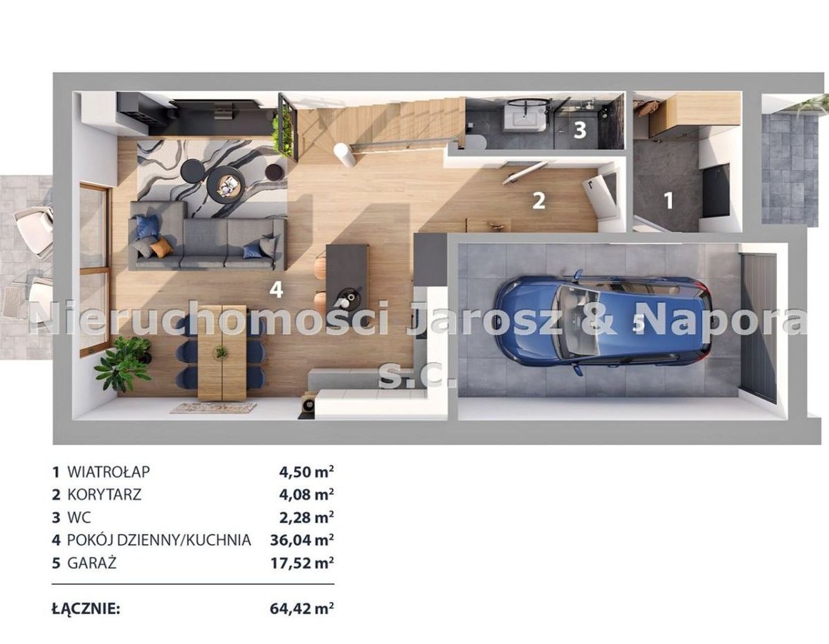 parter: pokój dzienny z aneksem kuchennym, łazienka z wc., korytarz, wiatrołap, garaż w bryle budynku