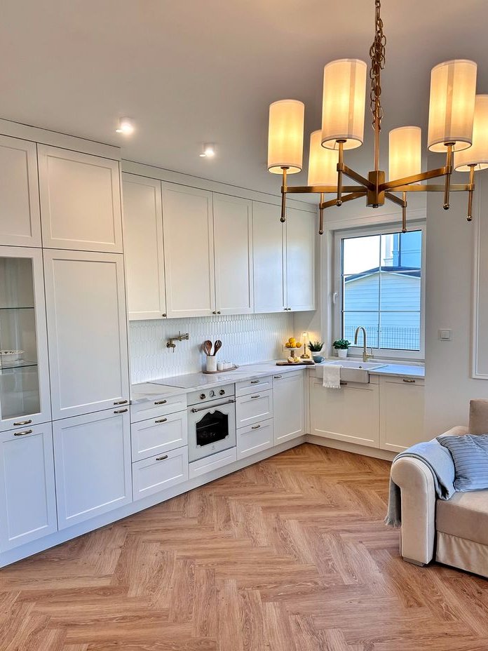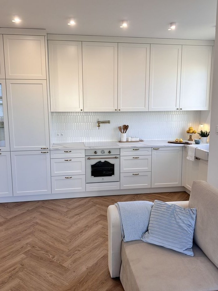 Nowe sprzęty AGD na gwarancji marki typu Electrolux (2 lata gwarancji) i Kernau (5 lat gwarancji): wbudowany piekarnik, płyta indukcyjna, okap, zmywarka i lodówka z zamrażarką. W całej zabudowie znajduję się bardzo dużo miejsca do przechowywania.