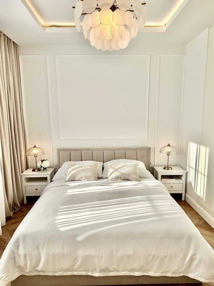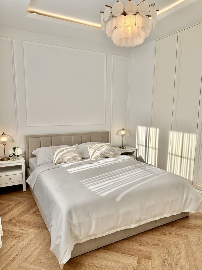 Łóżko z dużym pojemnikiem na przechowywanie rzeczy, pościeli itp. otwierane wygodnie za pomocą siłowników hydraulicznych. Duże pojemne szafy to kolejne miejsce na przechowanie licznej ilości rzeczy praktycznie jak w garderobie. Stoliki i lampki nocne nadające charakter sypialni. Dodatkowo podświetlane karnisze LED oraz sufit podświetlany od środka, sprawiający wieczorem piękną i przytulną atmosferę.