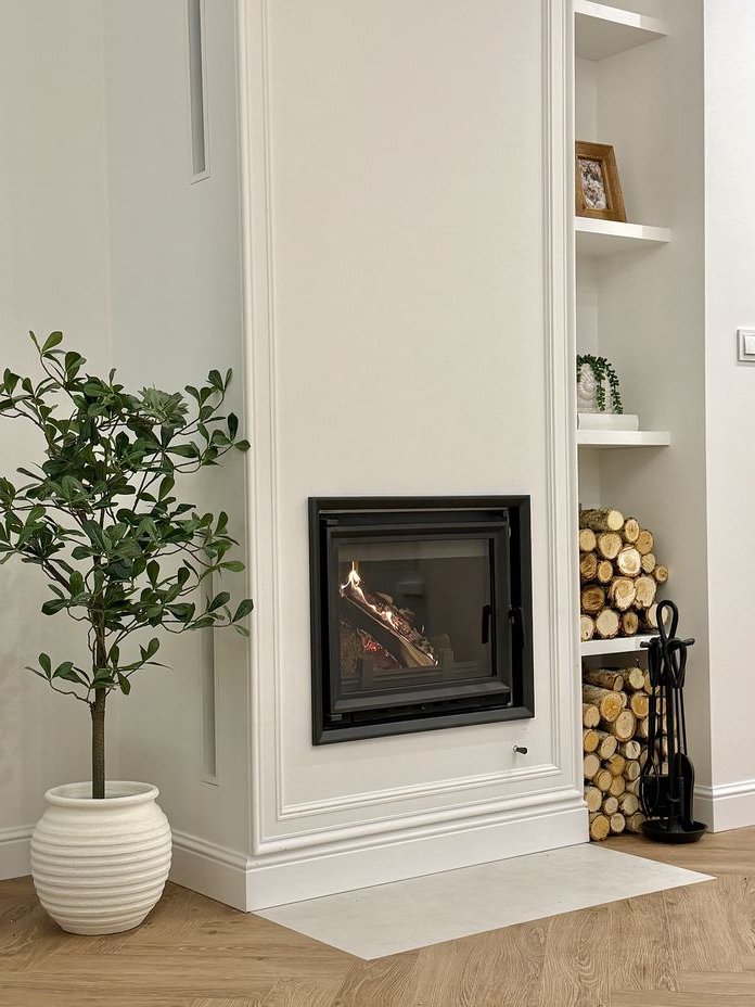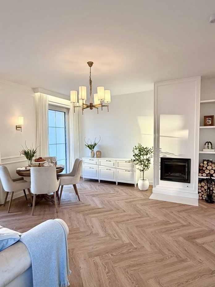 Oświetlenie podszafkowe w zabudowie kuchennej jak i w całym mieszkaniu są sterowane w wygodny sposób za pomocą czterostrefowego pilota. W części salonowej wygodna rozkładana trzyosobowa sofa (idealne miejsce na codzienny wypoczynek) oraz podłużna komoda RTV. W salonie znajduje się bardzo wydajny kominek 8 KW w zabudowie.