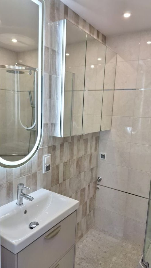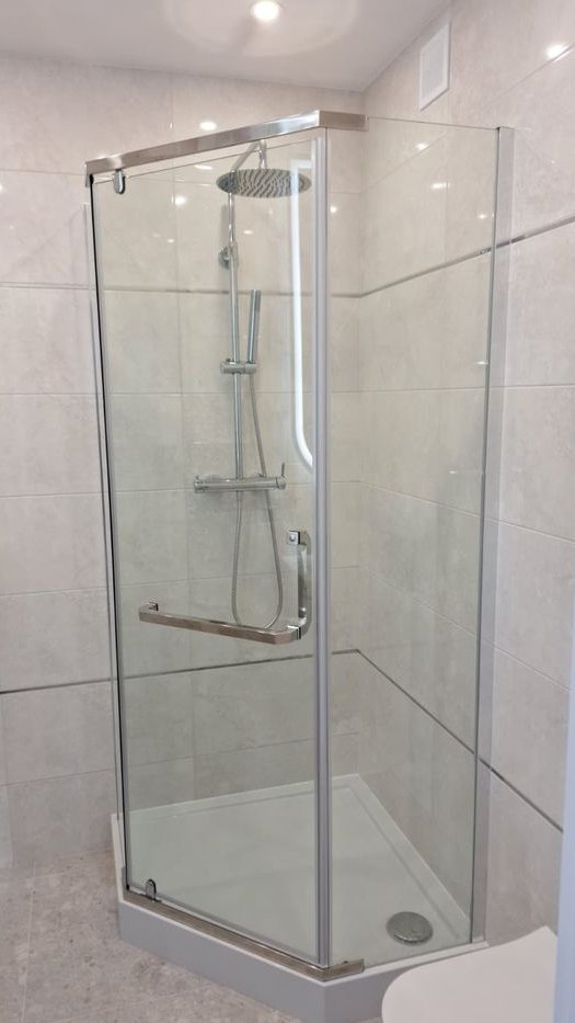 Nowa łazienka z prysznicem oraz zabudowaną toaletą