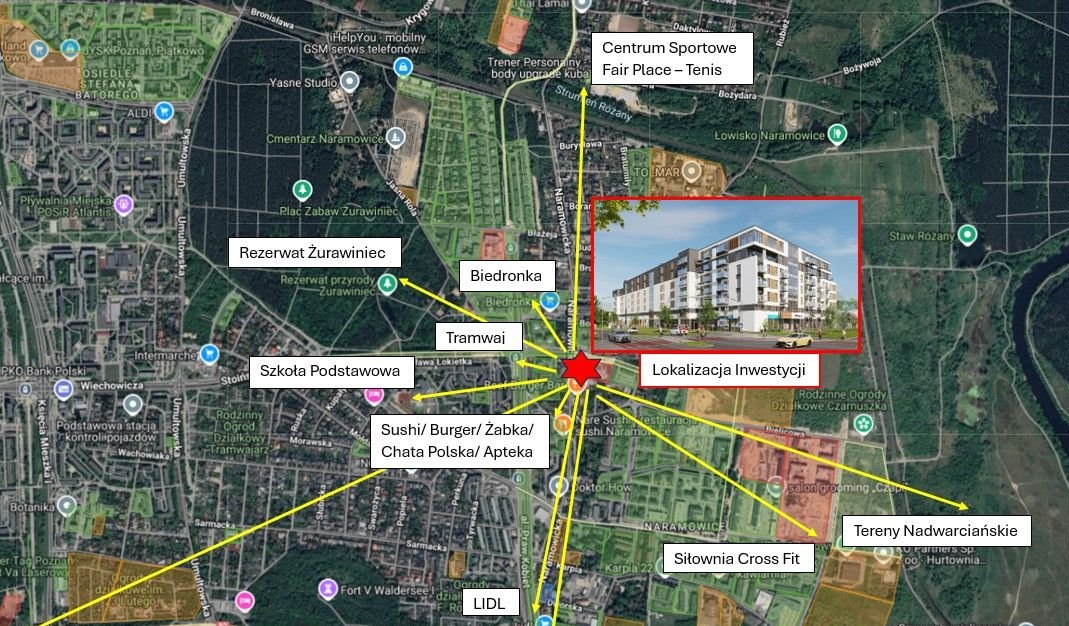 Inwestycja jest doskonale położona, zapewniając komfort mieszkania w cichej i spokojnej okolicy oraz dogodny dojazd do centrum na bazie układu szerokopasmowych dróg i komunikacji tramwajowej. To znakomite miejsce do życia dla rodzin i osób aktywnych. Nieopodal znajdują się popularny park Żurawiniec, rozległe tereny nadwarciańskie oraz układ ścieżek rowerowych zintegrowanych z całym miastem.