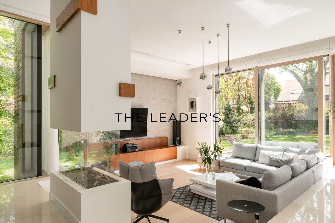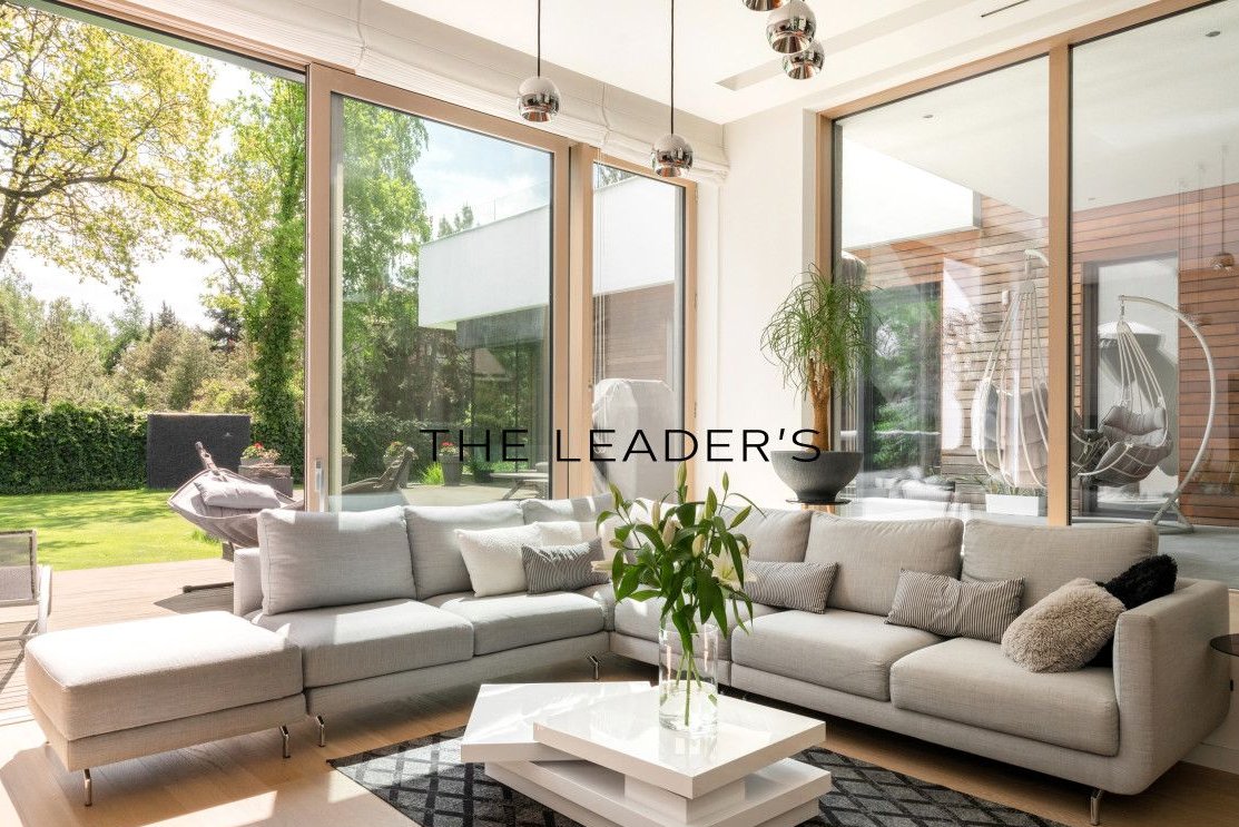 Przestronny salon z panoramicznymi oknami, szklanym kominkiem gazowym i wyjściem na zadbany ogród z automatycznym nawadnianiem i tarasem, stanowi serce tej rezydencji.