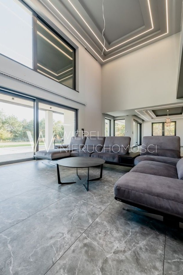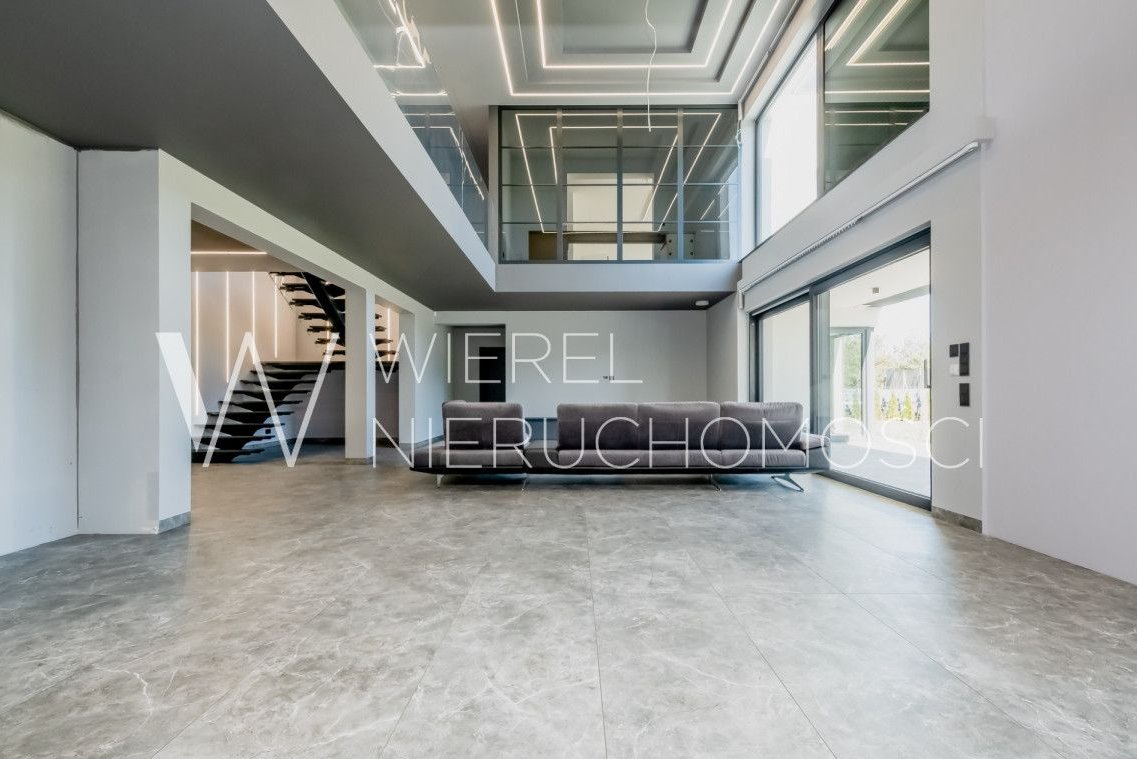 Sercem domu jest otwarta strefa dzienna - niezwykle reprezentacyjny salon o wysokości aż 8 metrów, z panoramicznym, dwukondygnacyjnym przeszkleniem, które wypełnia wnętrze naturalnym światłem.