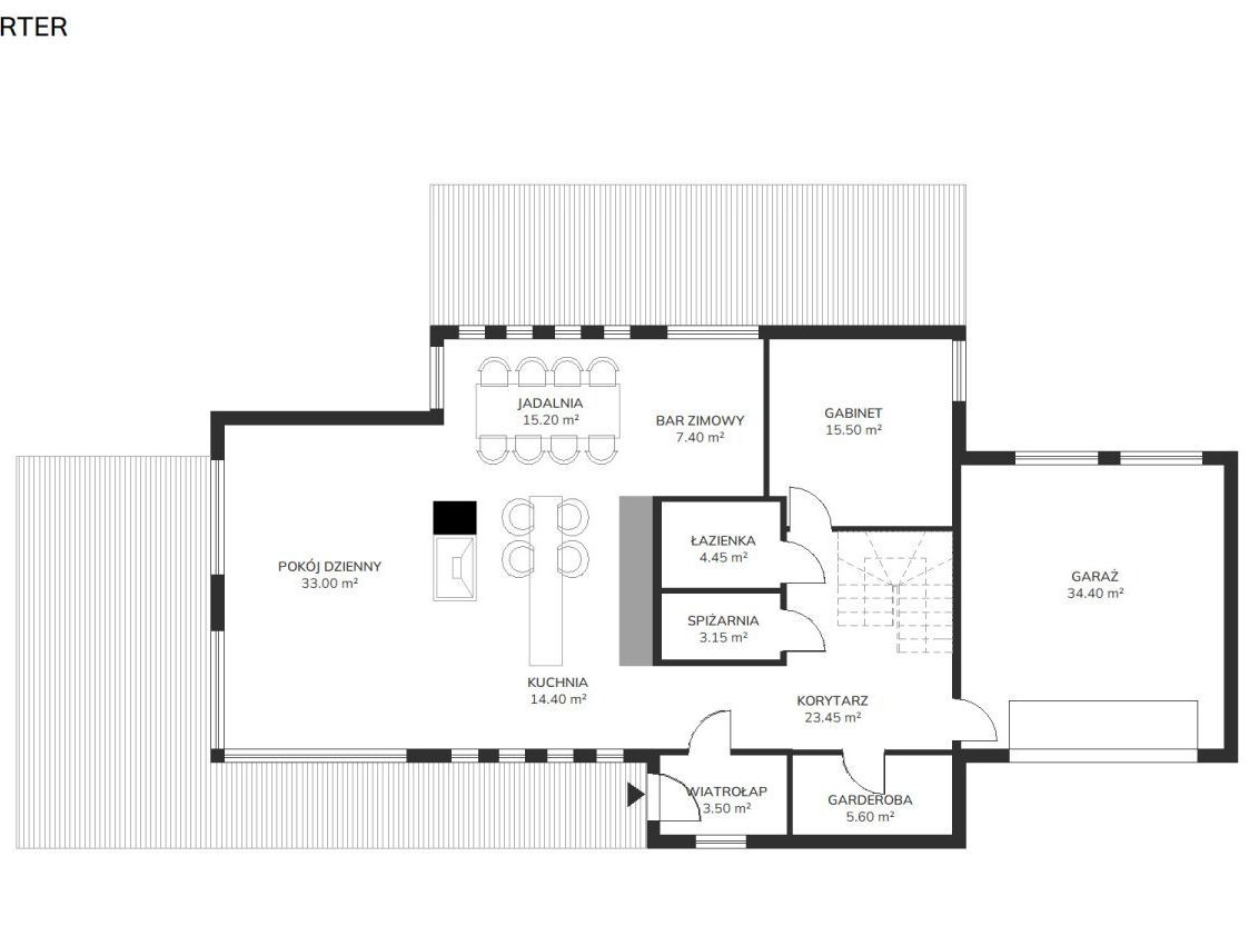 * kuchnię z potężną wyspą, płynnie połączona z jadalnią i zimowym barem - łącznie ok. 37 m2,