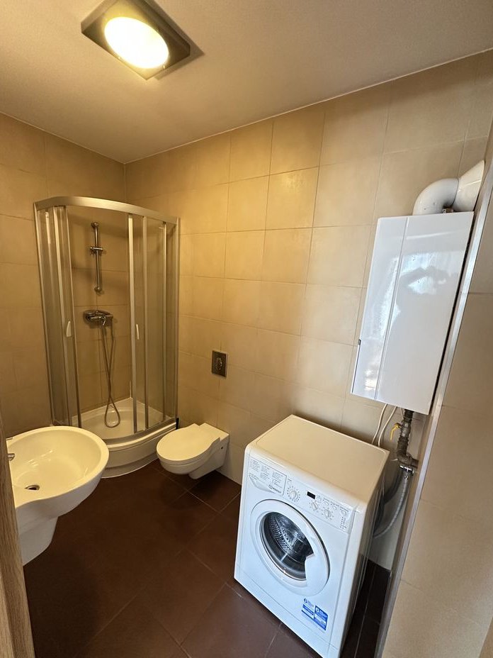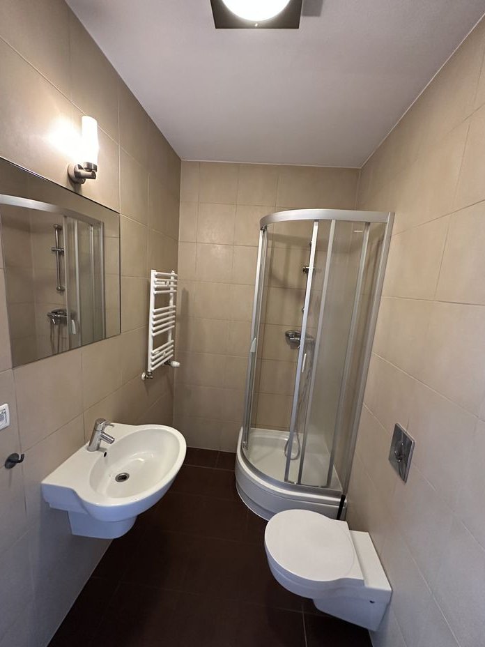 Łazienka z nowoczesnym wyposażeniem, dużą kabiną prysznicową i wysokim standardem wykończenia.