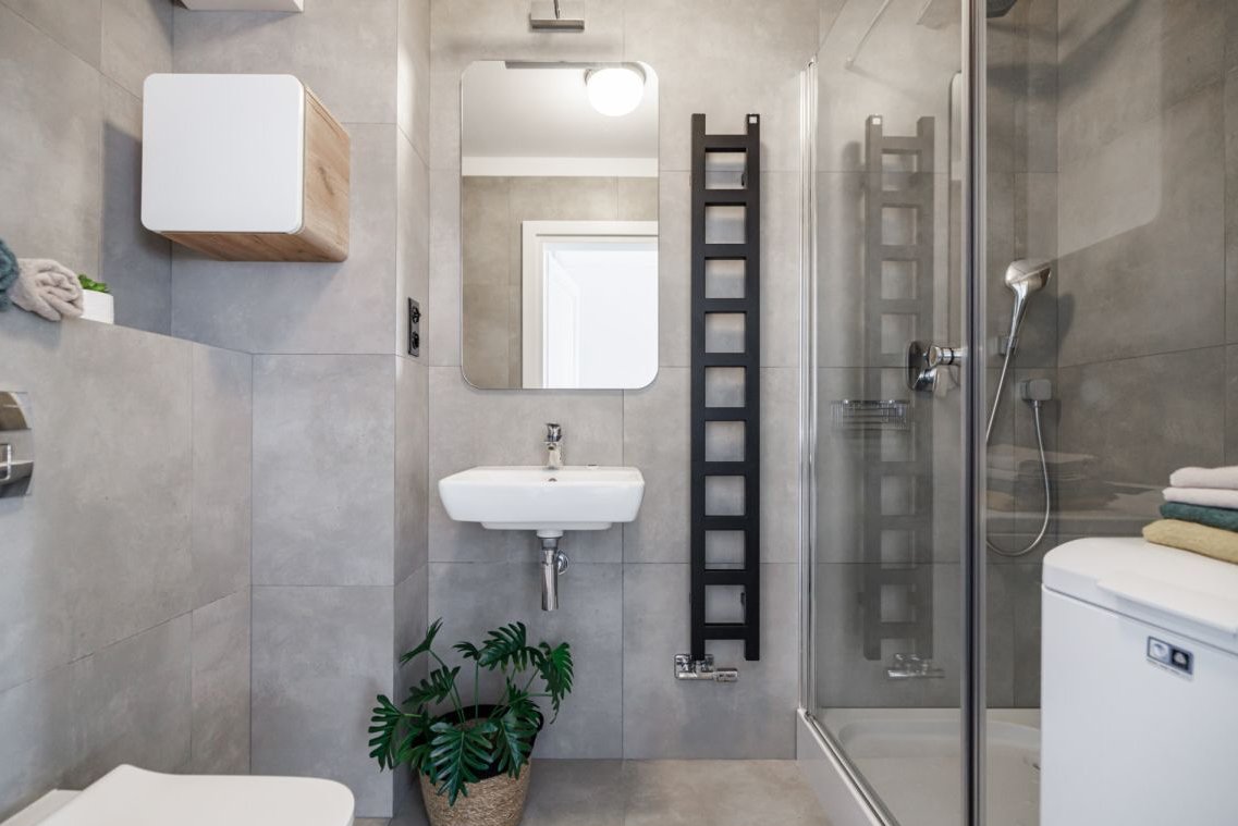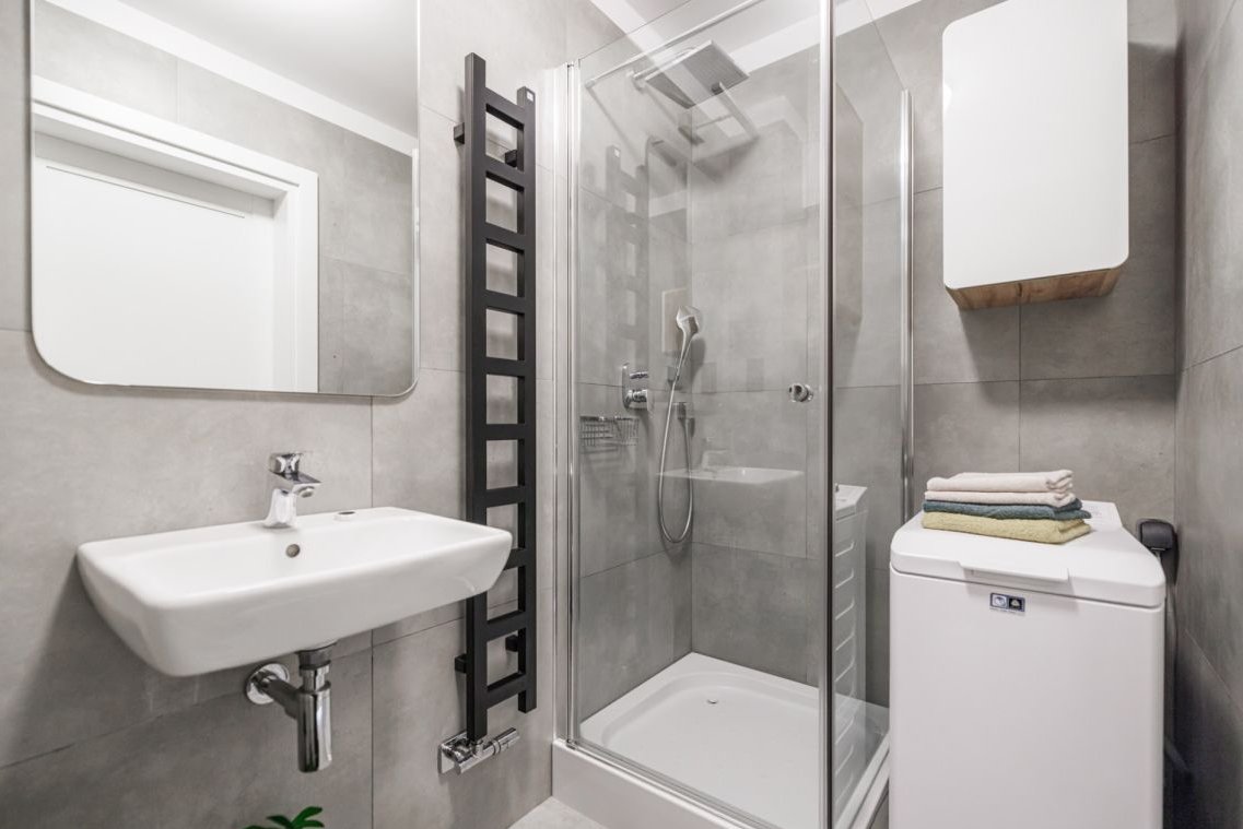 • łazienka z prysznicem i pralką
