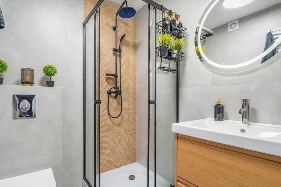 Łazienka wykończona została w nowoczesnym stylu – z kabiną prysznicową, czarną armaturą i drewnianymi akcentami.