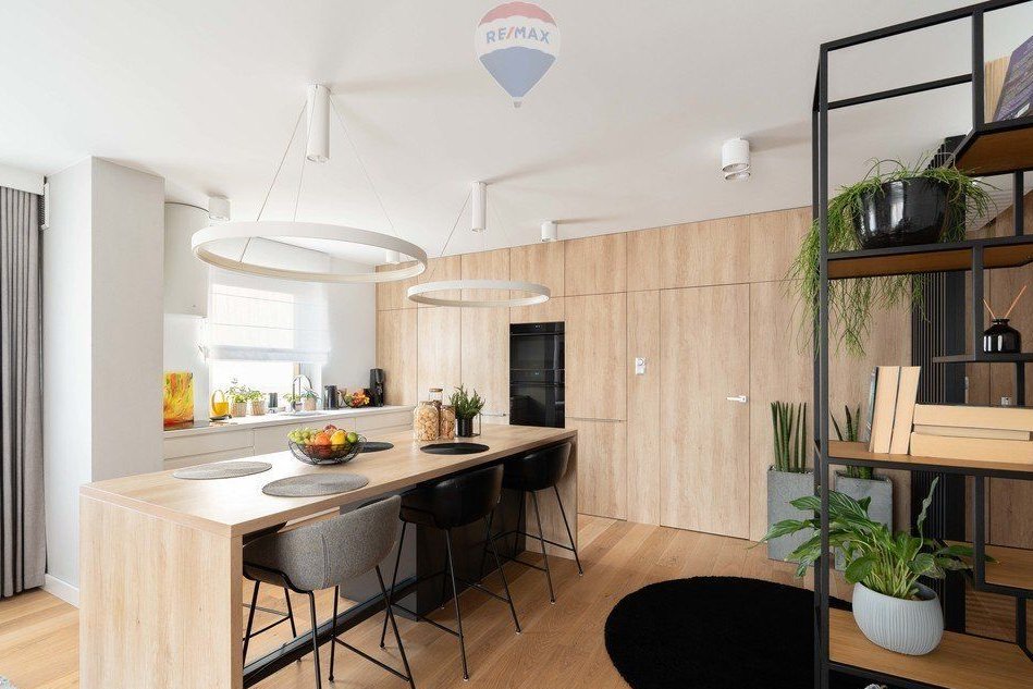 • w aneksie kuchennym praktyczna wyspa i wkomponowane w ścianę meble z wyposażeniem AGD wysokiej klasy (płyta indukcyjna, piekarnik, zmywarka, lodówko-zamrażarka);